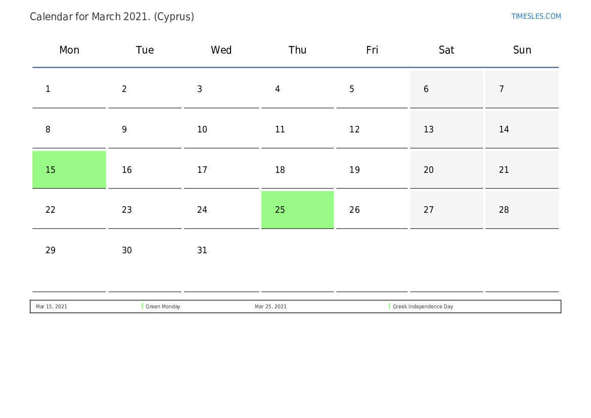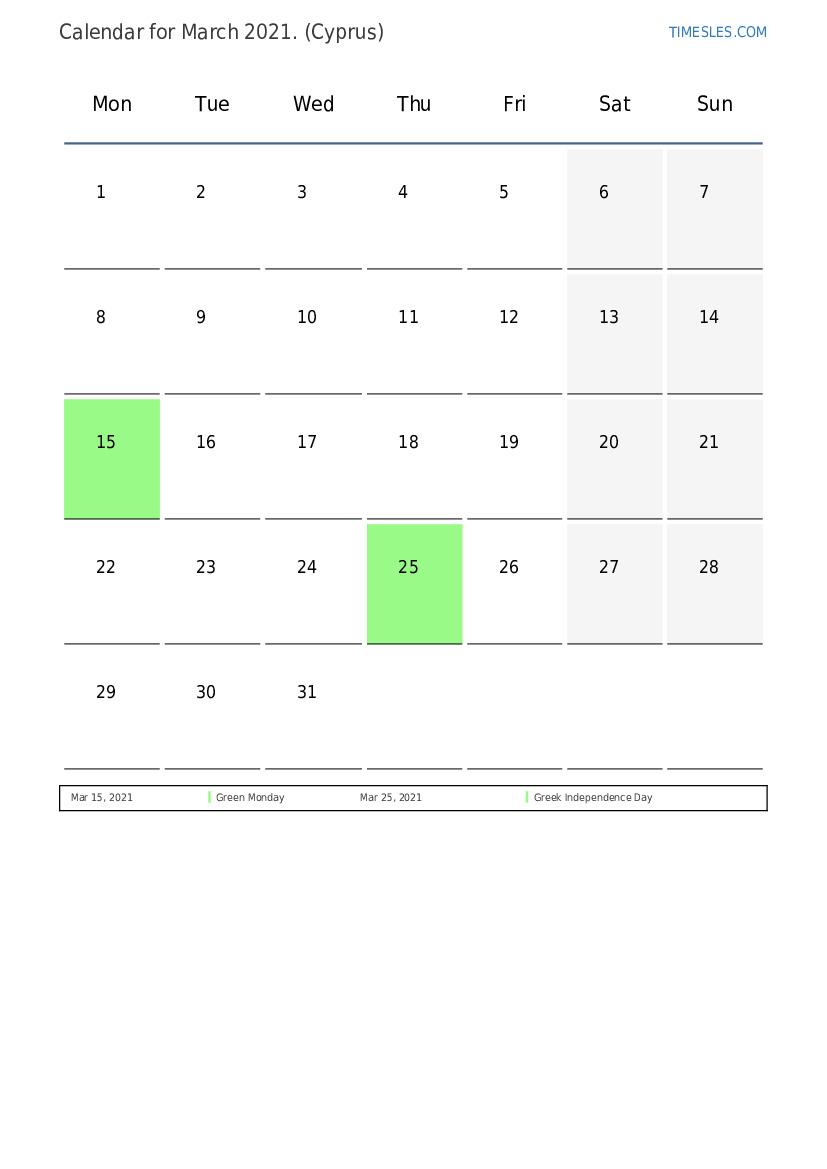 The month of March contains 31 days. This is 3 month of 2021. Season of the year: spring. The month of March starts on Monday and ends on Wednesday. In the month of March 2021, there are 4 holidays and days off in Cyprus.