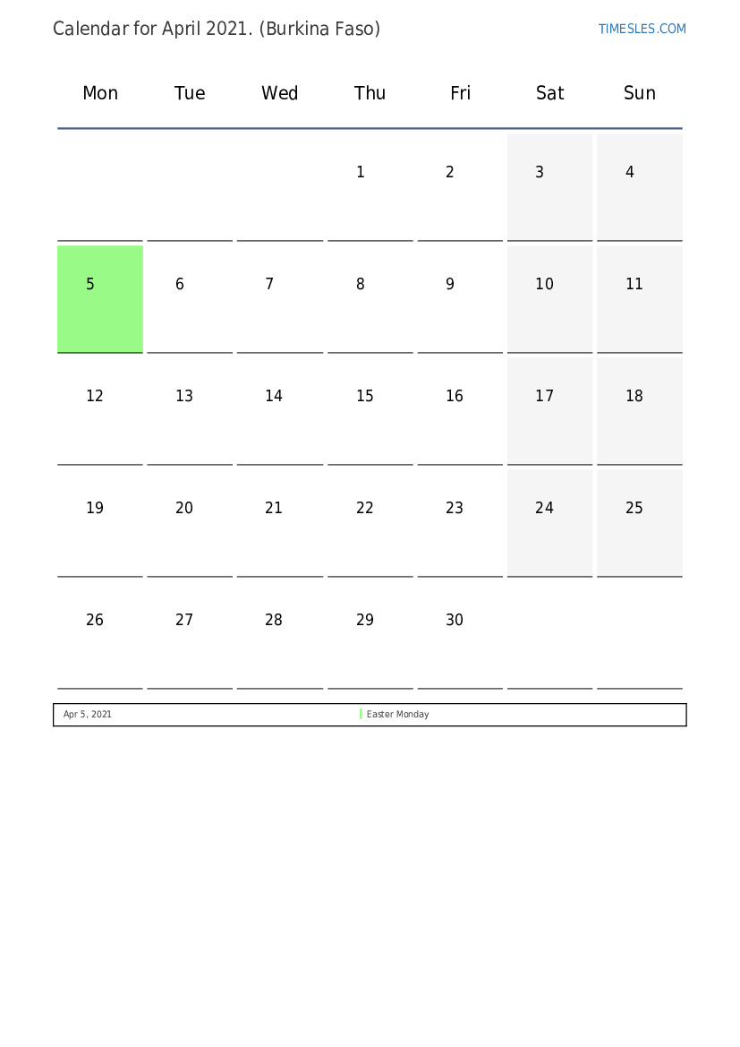 The month of April contains 30 days. This is 4 month of 2021. Season of the year: spring. The month of April starts on Thursday and ends on Friday. In the month of April 2021, there are 1 holiday and day off in Burkina Faso.