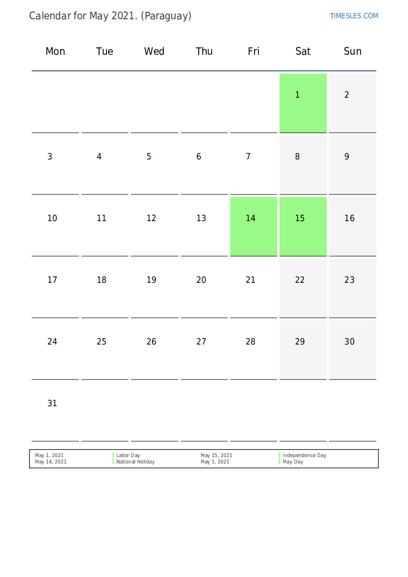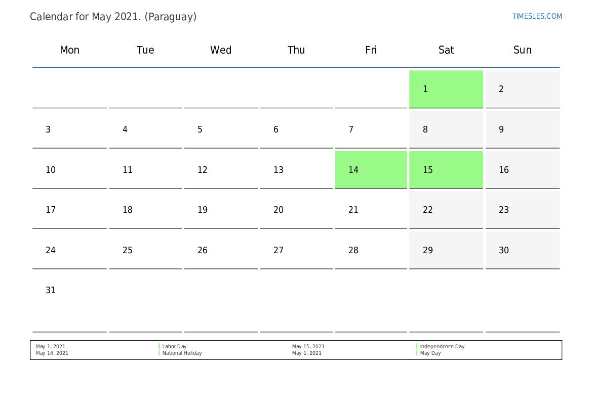 The month of May contains 31 days. This is 5 month of 2021. Season of the year: spring. The month of May starts on Saturday and ends on Monday. In the month of May 2021, there are 4 holidays and days off in Paraguay.