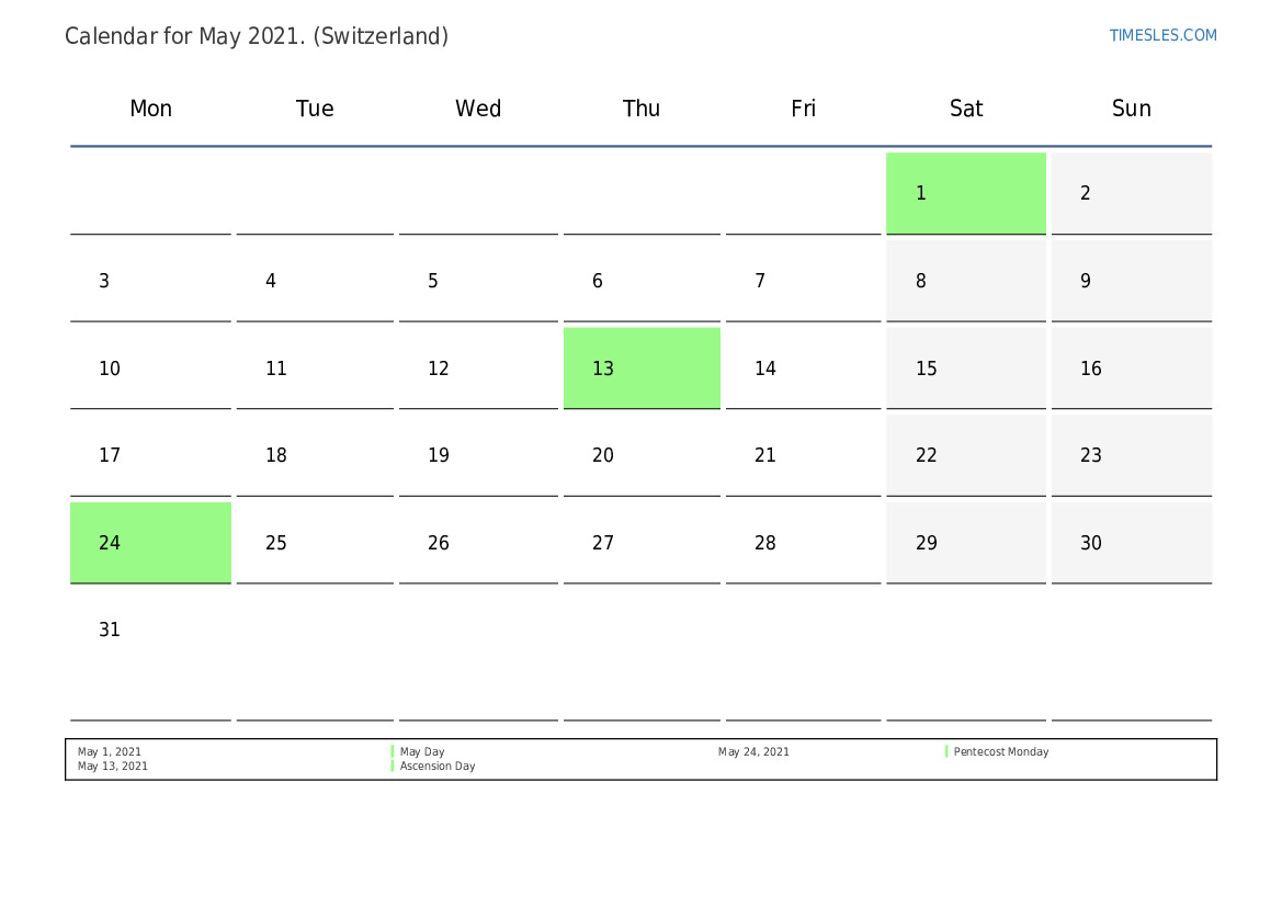 Holidays and Weekends Calendar for May 2021 for Switzerland