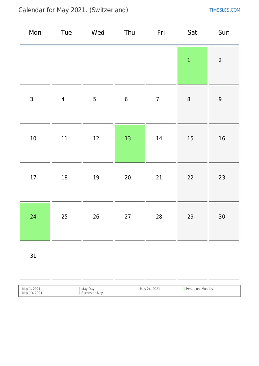 The month of May contains 31 days. This is 5 month of 2021. Season of the year: spring. The month of May starts on Saturday and ends on Monday. In the month of May 2021, there are 4 holidays and days off in Switzerland.