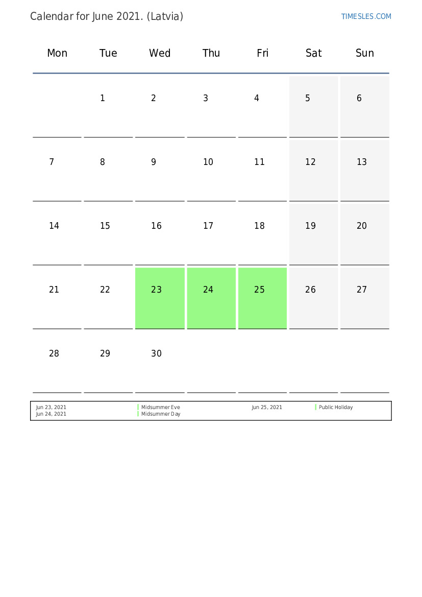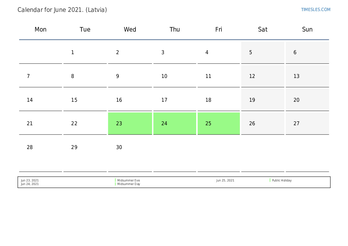 Holidays and Weekends Calendar for June 2021 for Latvia