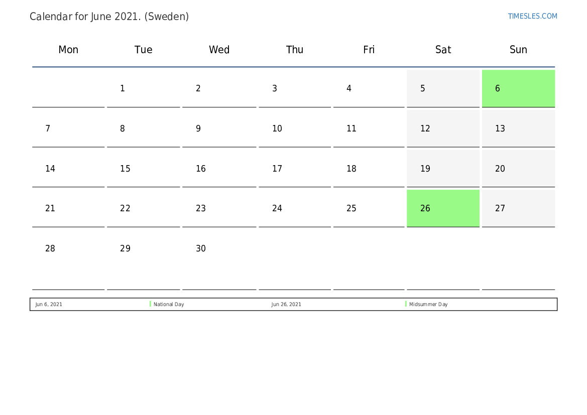 Holidays and Weekends Calendar for June 2021 for Sweden
