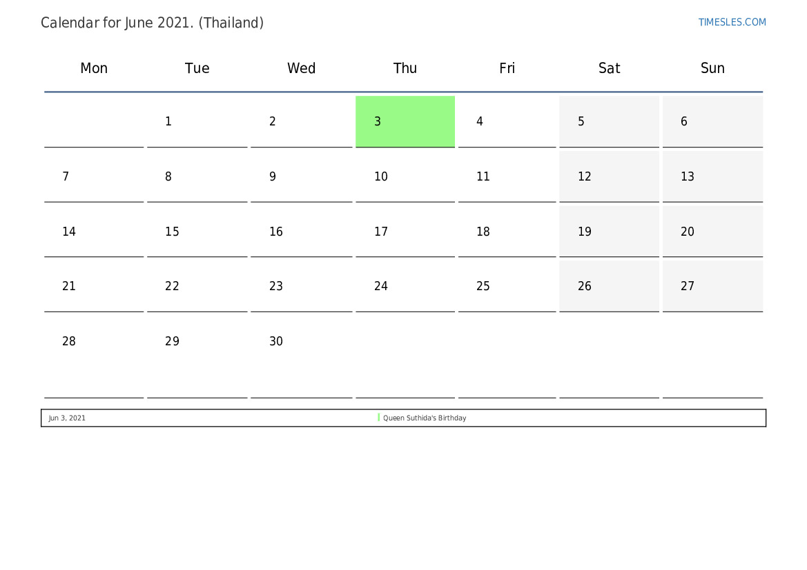 Download and print PDF calendar with holidays and weekends for June 2021 for Thailand