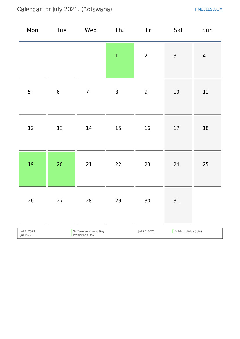 The month of July contains 31 days. This is 7 month of 2021. Season of the year: summer. The month of July starts on Thursday and ends on Saturday. In the month of July 2021, there are 3 holidays and days off in Botswana.
