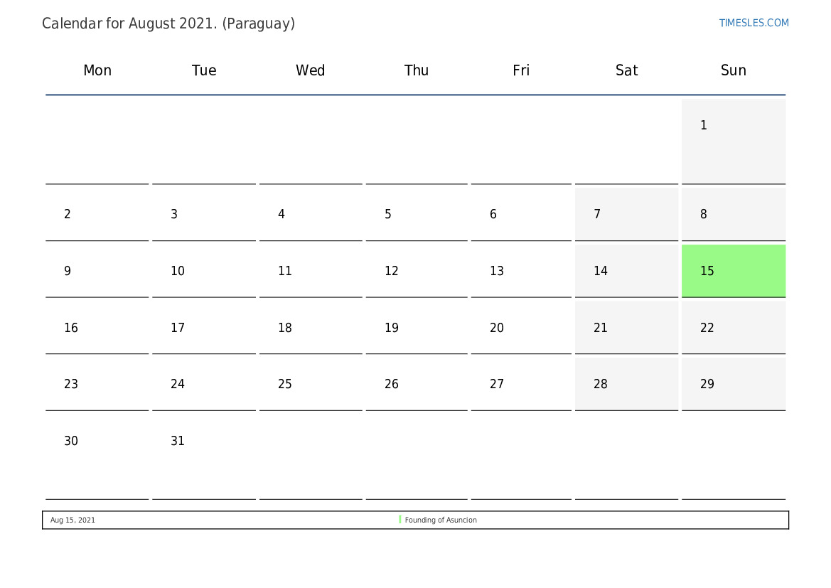 Holidays and Weekends Calendar for August 2021 for Paraguay