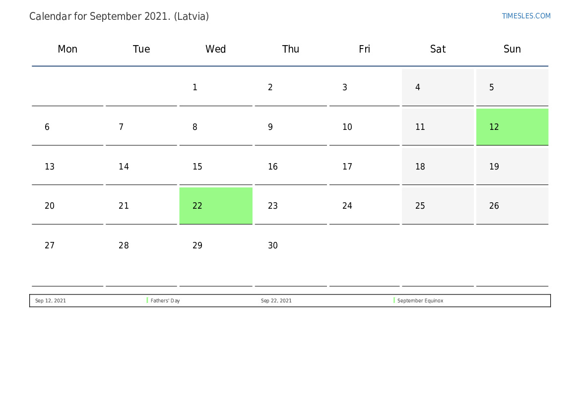 Holidays and Weekends Calendar for September 2021 for Latvia