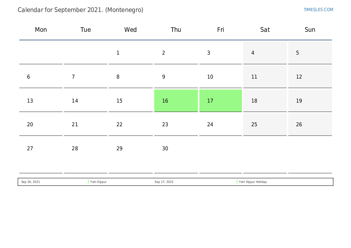 Holidays and Weekends Calendar for September 2021 for Montenegro