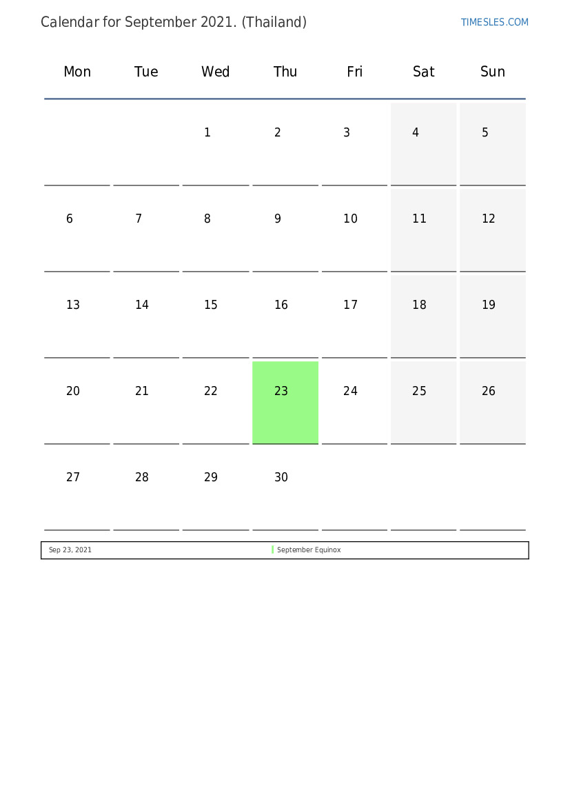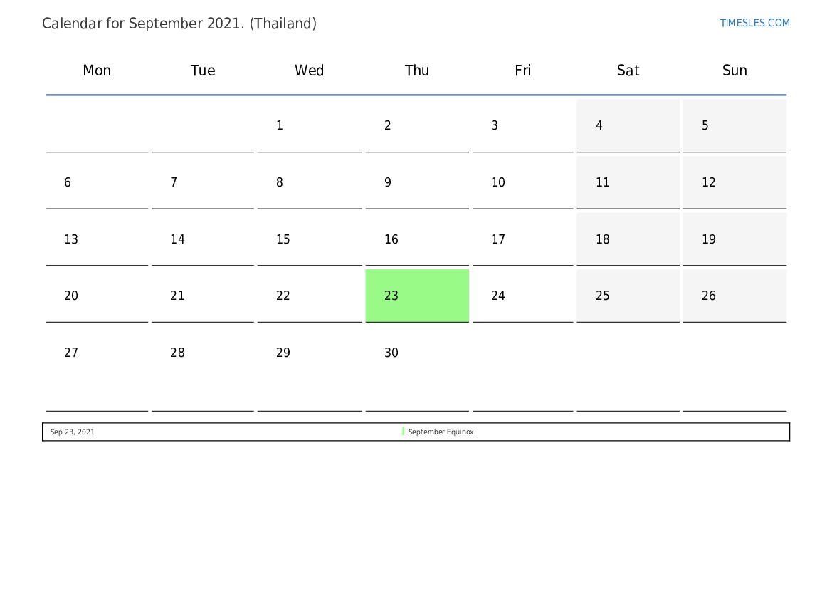 The month of September contains 30 days. This is 9 month of 2021. Season of the year: autumn. The month of September starts on Wednesday and ends on Thursday. In the month of September 2021, there are 1 holiday and day off in Thailand.
