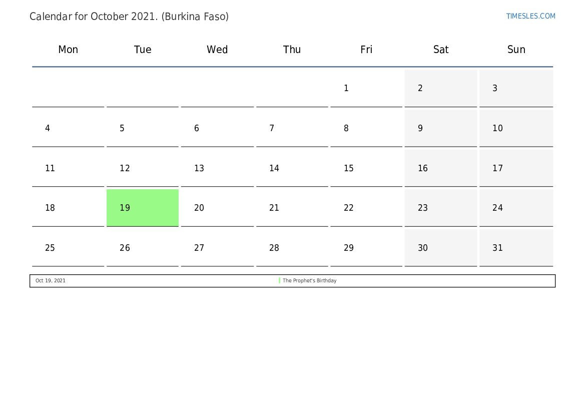 The month of October contains 31 days. This is 10 month of 2021. Season of the year: autumn. The month of October starts on Friday and ends on Sunday. In the month of October 2021, there are 1 holiday and day off in Burkina Faso.