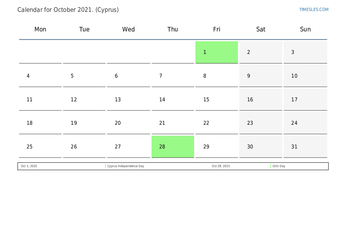 Holidays and Weekends Calendar for October 2021 for Cyprus