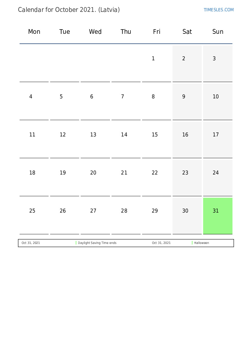 Holidays and Weekends Calendar for October 2021 for Latvia