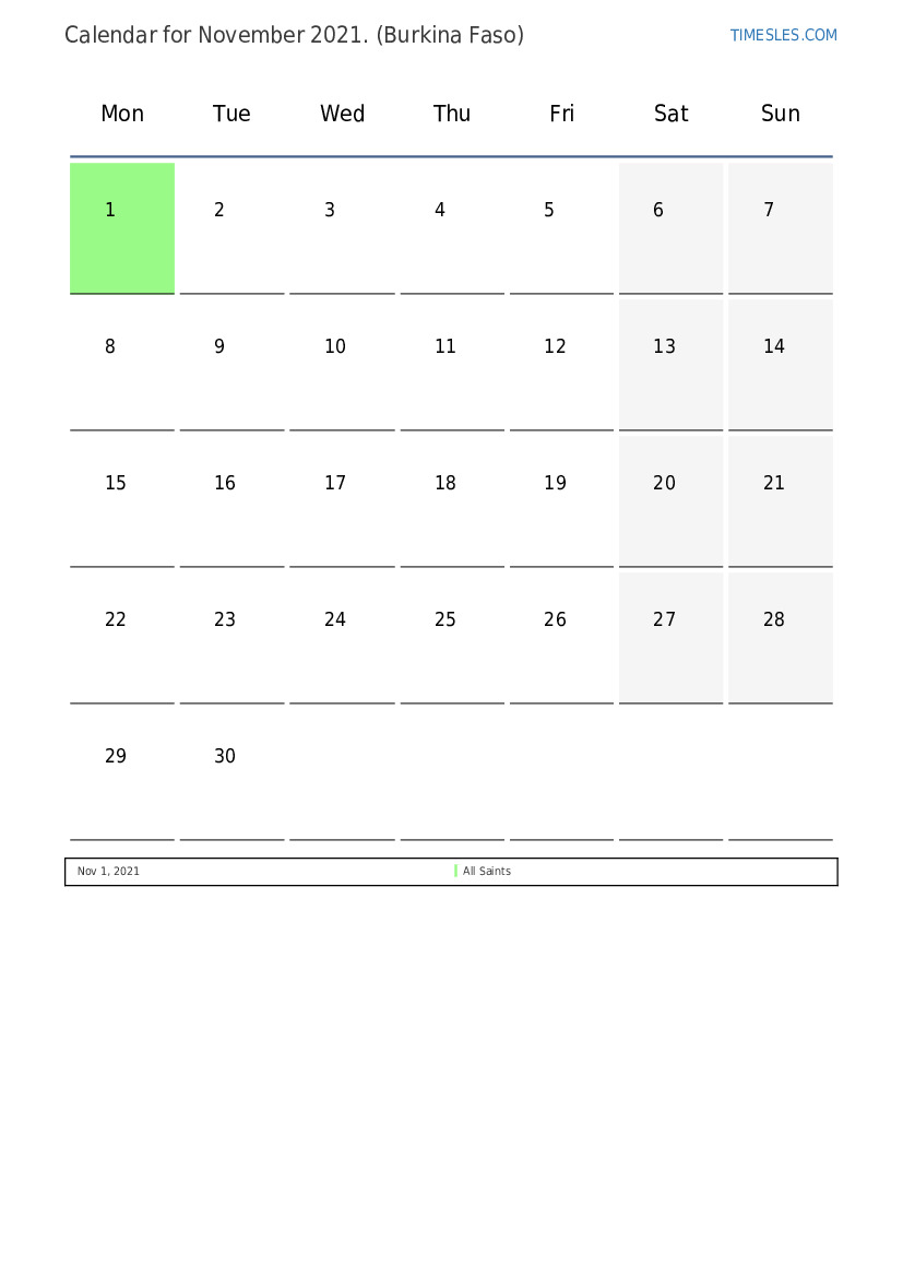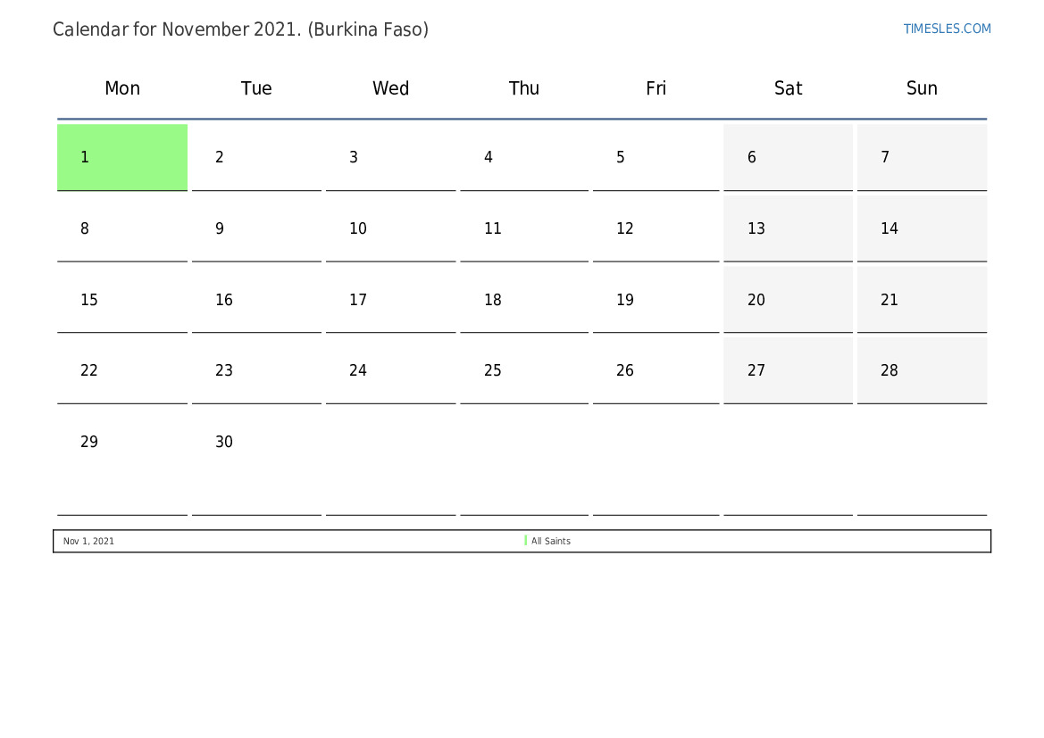 The month of November contains 30 days. This is 11 month of 2021. Season of the year: autumn. The month of November starts on Monday and ends on Tuesday. In the month of November 2021, there are 1 holiday and day off in Burkina Faso.