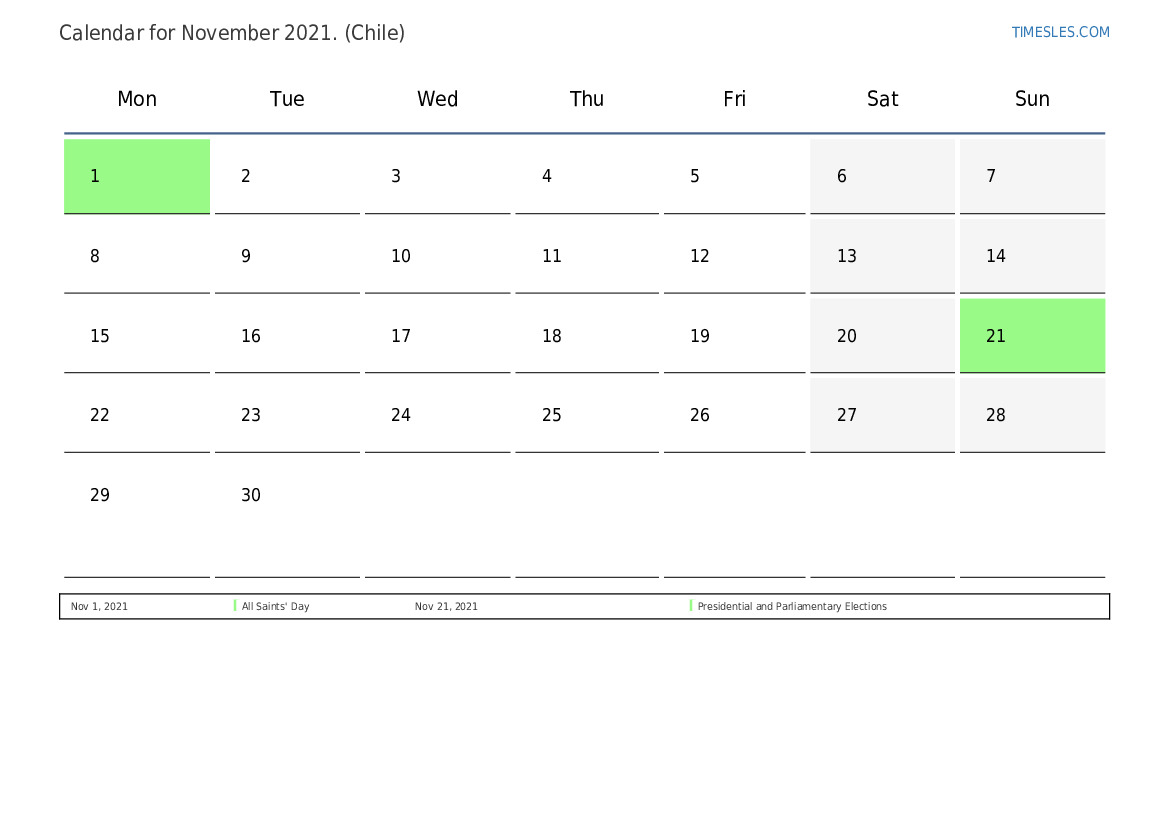The month of November contains 30 days. This is 11 month of 2021. Season of the year: autumn. The month of November starts on Monday and ends on Tuesday. In the month of November 2021, there are 2 holidays and days off in Chile.