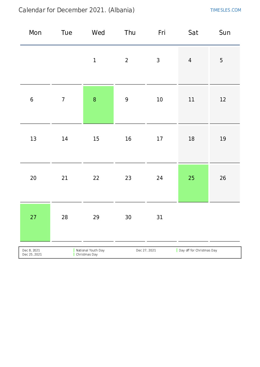The month of December contains 31 days. This is 12 month of 2021. Season of the year: winter. The month of December starts on Wednesday and ends on Friday. In the month of December 2021, there are 6 holidays and days off in Albania.