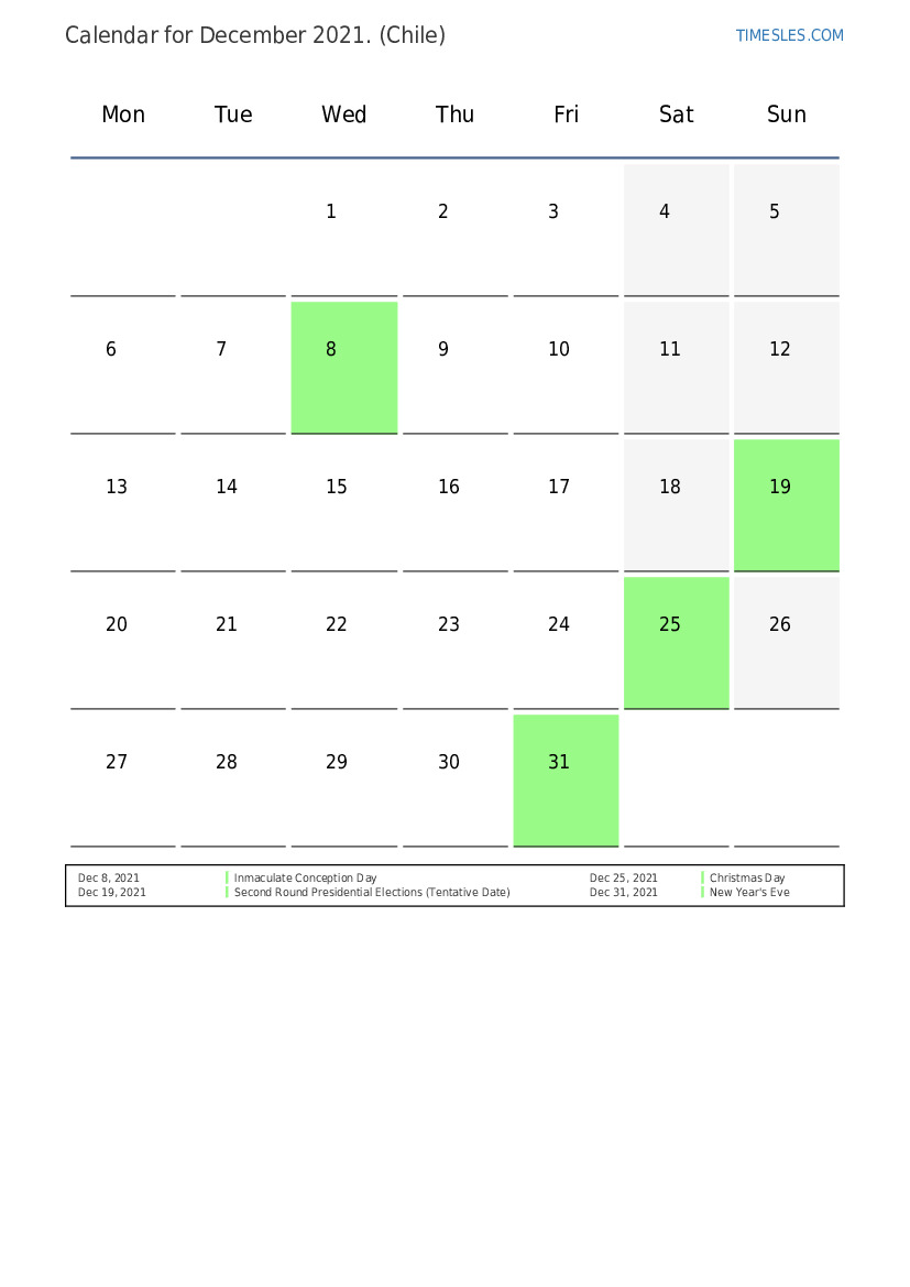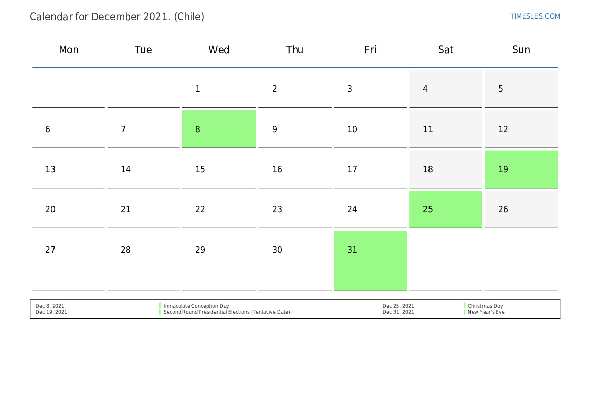 The month of December contains 31 days. This is 12 month of 2021. Season of the year: winter. The month of December starts on Wednesday and ends on Friday. In the month of December 2021, there are 5 holidays and days off in Chile.