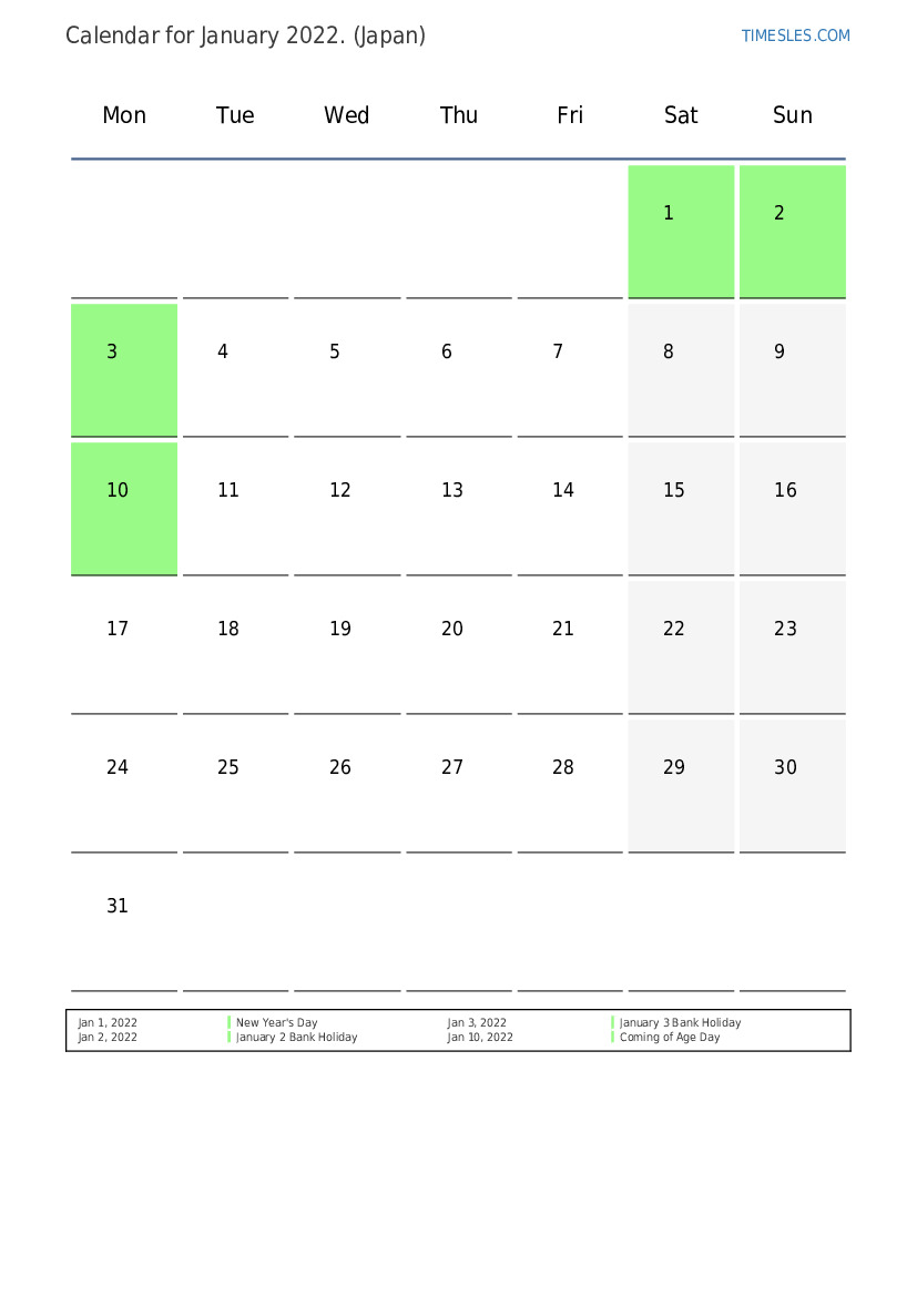 The month of January contains 31 days. This is 1 month of 2022. Season of the year: winter. The month of January starts on Saturday and ends on Monday. In the month of January 2022, there are 4 holidays and days off in Japan.