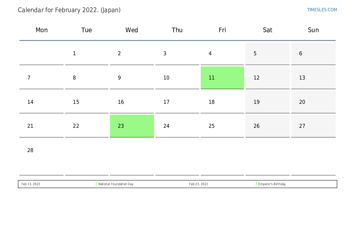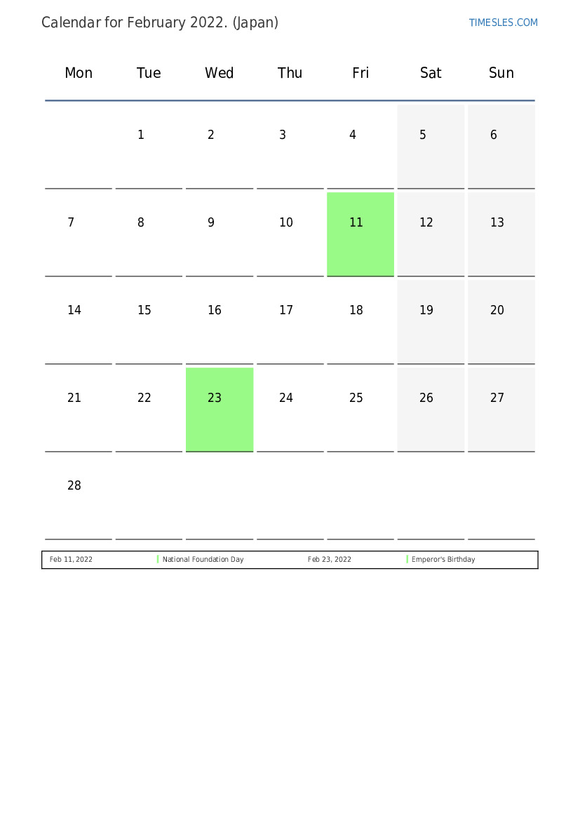 The month of February contains 28 days. This is 2 month of 2022. Season of the year: winter. The month of February starts on Tuesday and ends on Monday. In the month of February 2022, there are 3 holidays and days off in Japan.