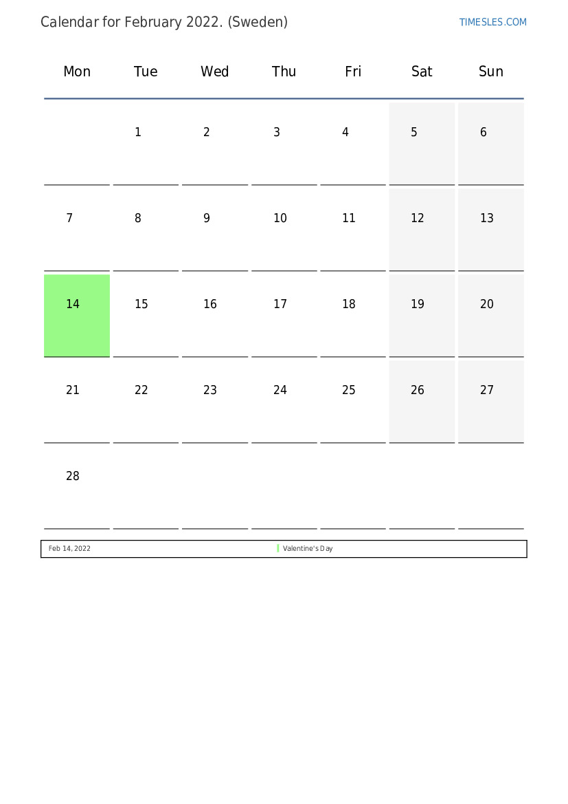 The month of February contains 28 days. This is 2 month of 2022. Season of the year: winter. The month of February starts on Tuesday and ends on Monday. In the month of February 2022, there are 1 holiday and day off in Sweden.