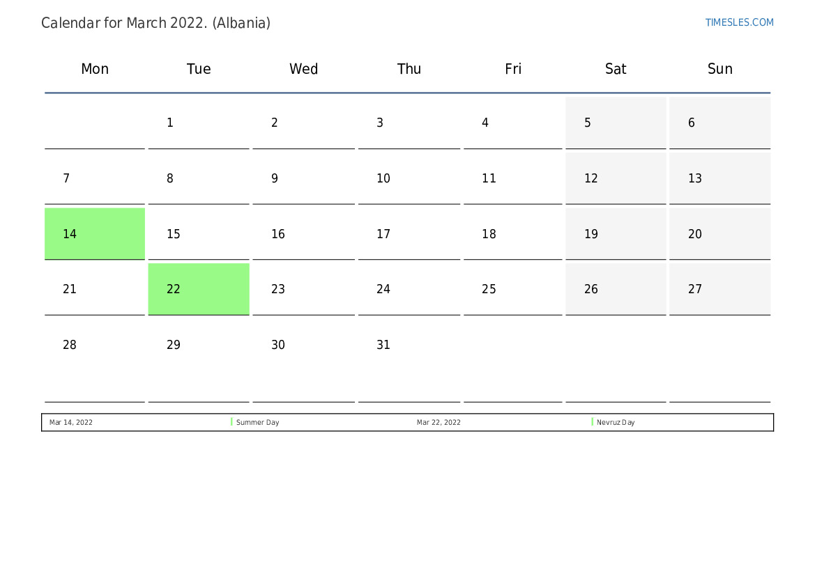 The month of March contains 31 days. This is 3 month of 2022. Season of the year: spring. The month of March starts on Tuesday and ends on Thursday. In the month of March 2022, there are 5 holidays and days off in Albania.