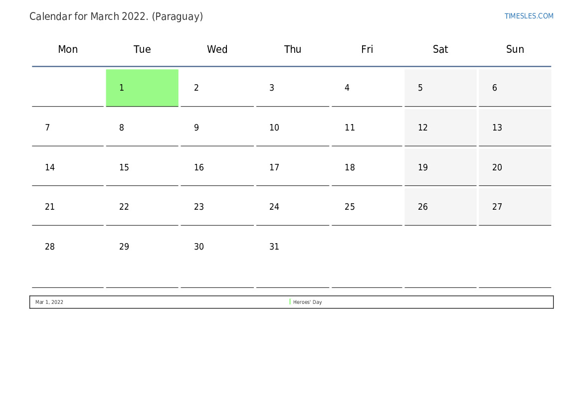 The month of March contains 31 days. This is 3 month of 2022. Season of the year: spring. The month of March starts on Tuesday and ends on Thursday. In the month of March 2022, there are 3 holidays and days off in Paraguay.