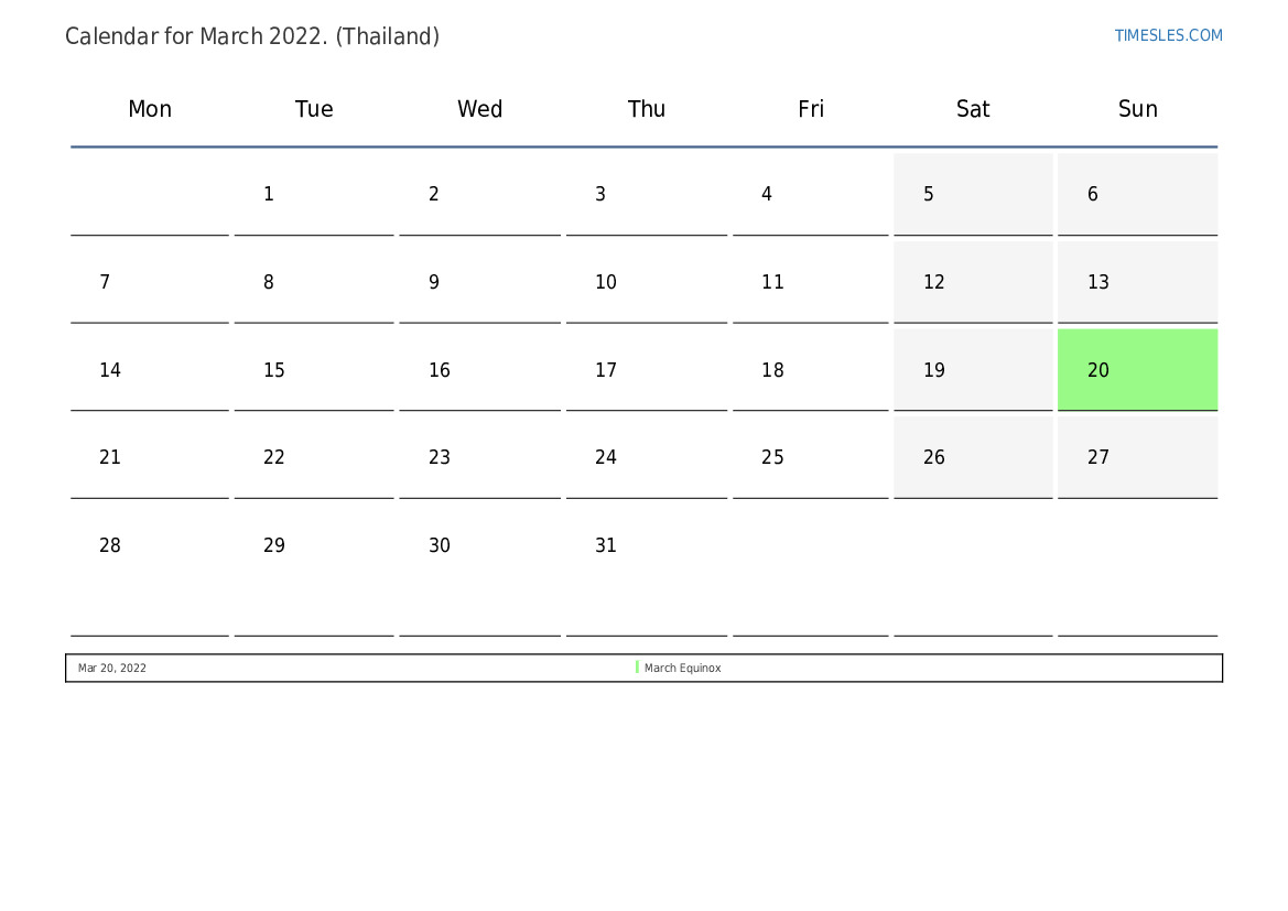 The month of March contains 31 days. This is 3 month of 2022. Season of the year: spring. The month of March starts on Tuesday and ends on Thursday. In the month of March 2022, there are 1 holiday and day off in Thailand.