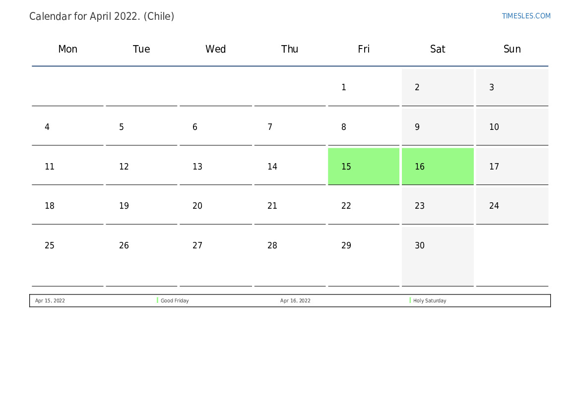 The month of April contains 30 days. This is 4 month of 2022. Season of the year: spring. The month of April starts on Friday and ends on Saturday. In the month of April 2022, there are 4 holidays and days off in Chile.