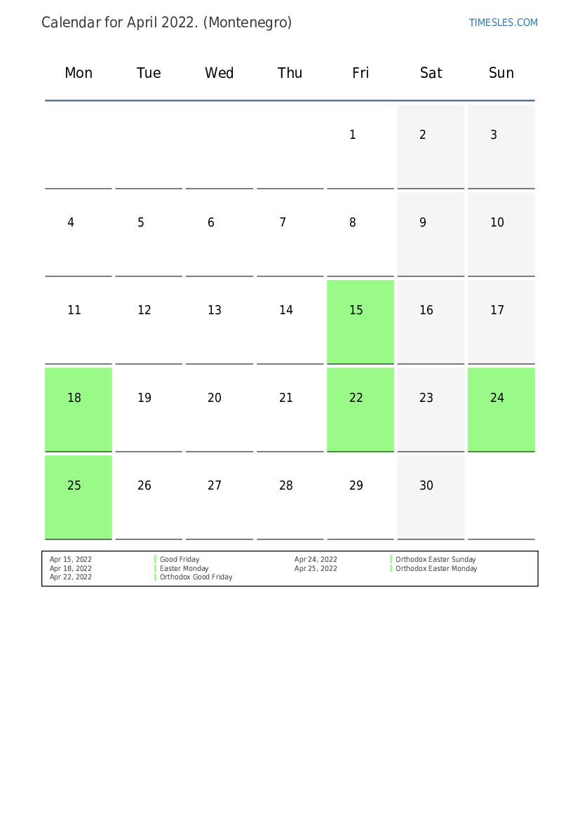 Holidays and Weekends Calendar for April 2022 for Montenegro