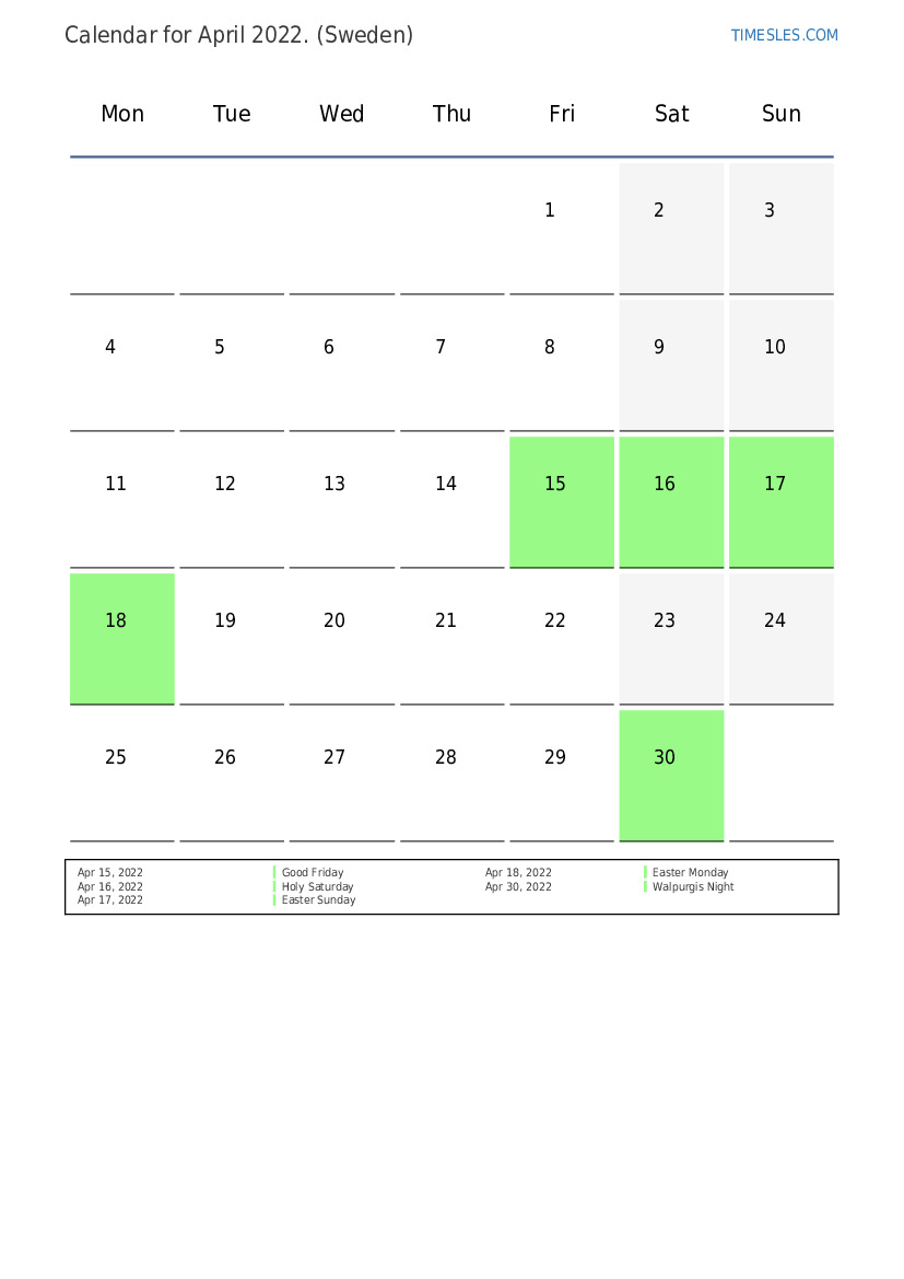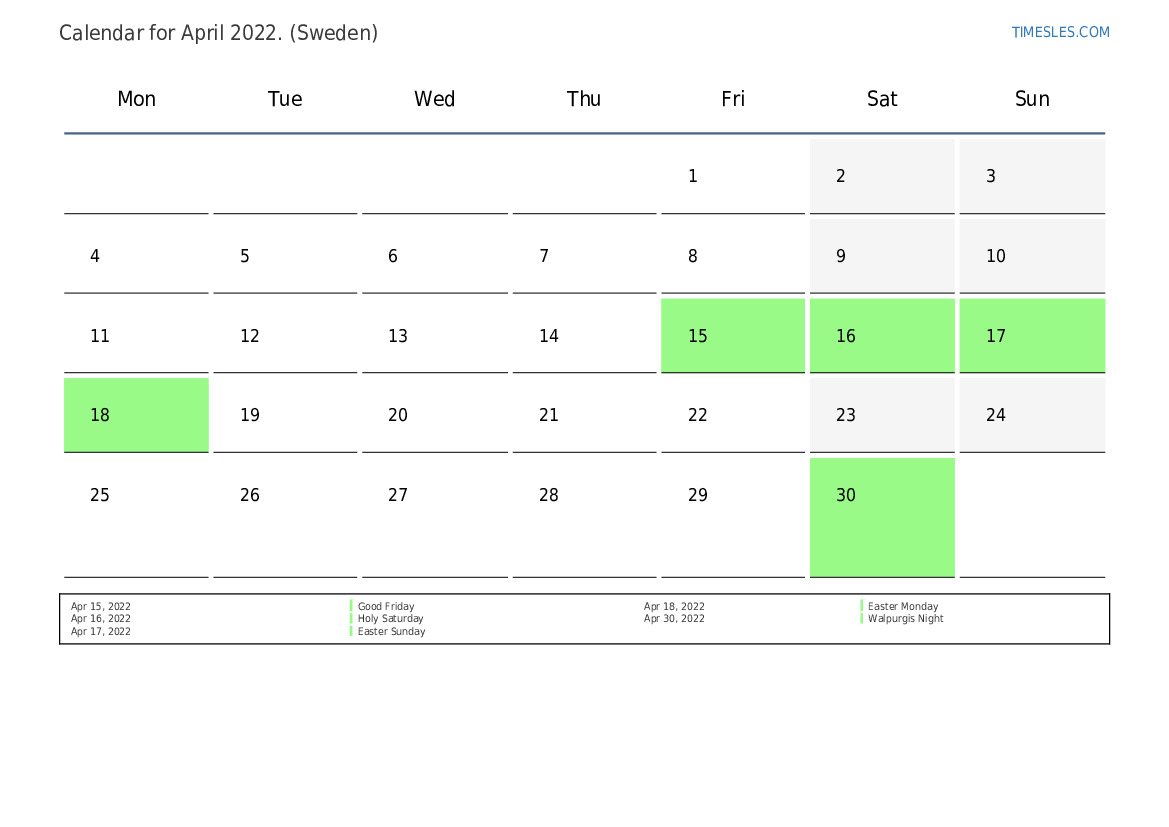 Holidays and Weekends Calendar for April 2022 for Sweden