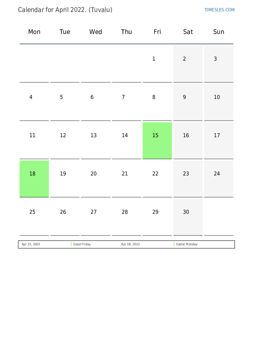 Holidays and Weekends Calendar for April 2022 for Tuvalu
