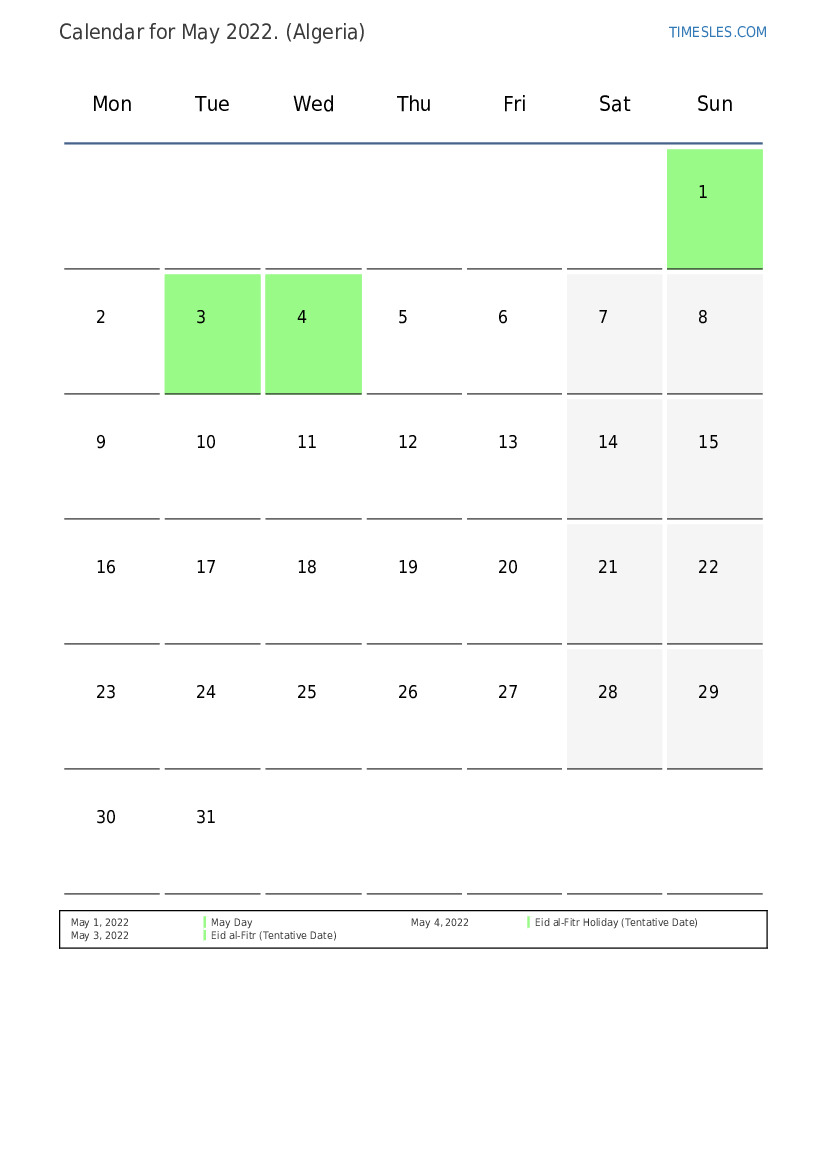 Holidays and Weekends Calendar for May 2022 for Algeria