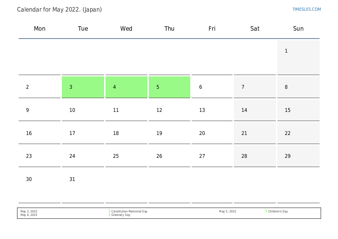 The month of May contains 31 days. This is 5 month of 2022. Season of the year: spring. The month of May starts on Sunday and ends on Tuesday. In the month of May 2022, there are 3 holidays and days off in Japan.