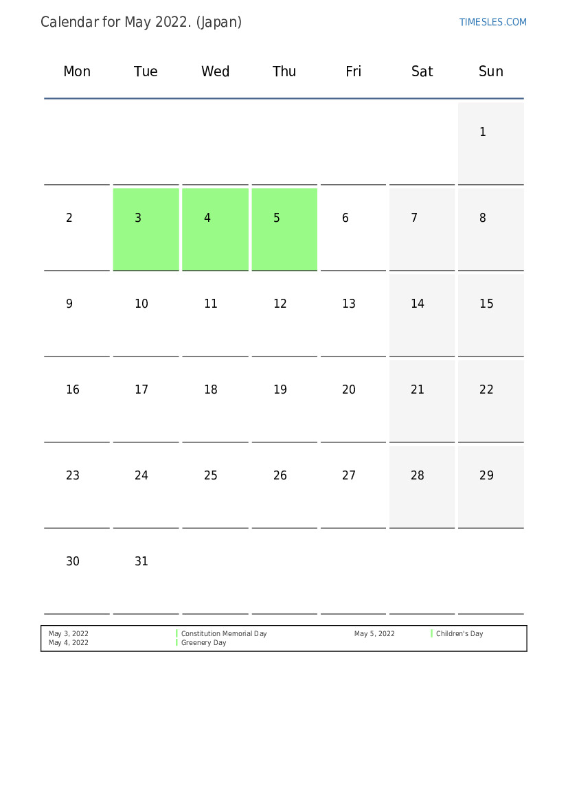 Holidays and Weekends Calendar for May 2022 for Japan
