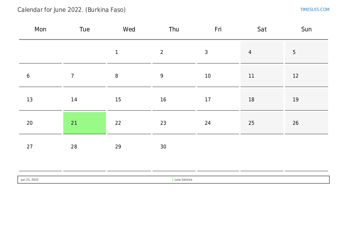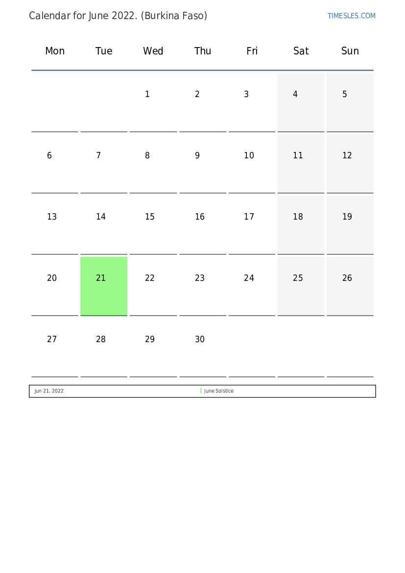 The month of June contains 30 days. This is 6 month of 2022. Season of the year: summer. The month of June starts on Wednesday and ends on Thursday. In the month of June 2022, there are 1 holiday and day off in Burkina Faso.