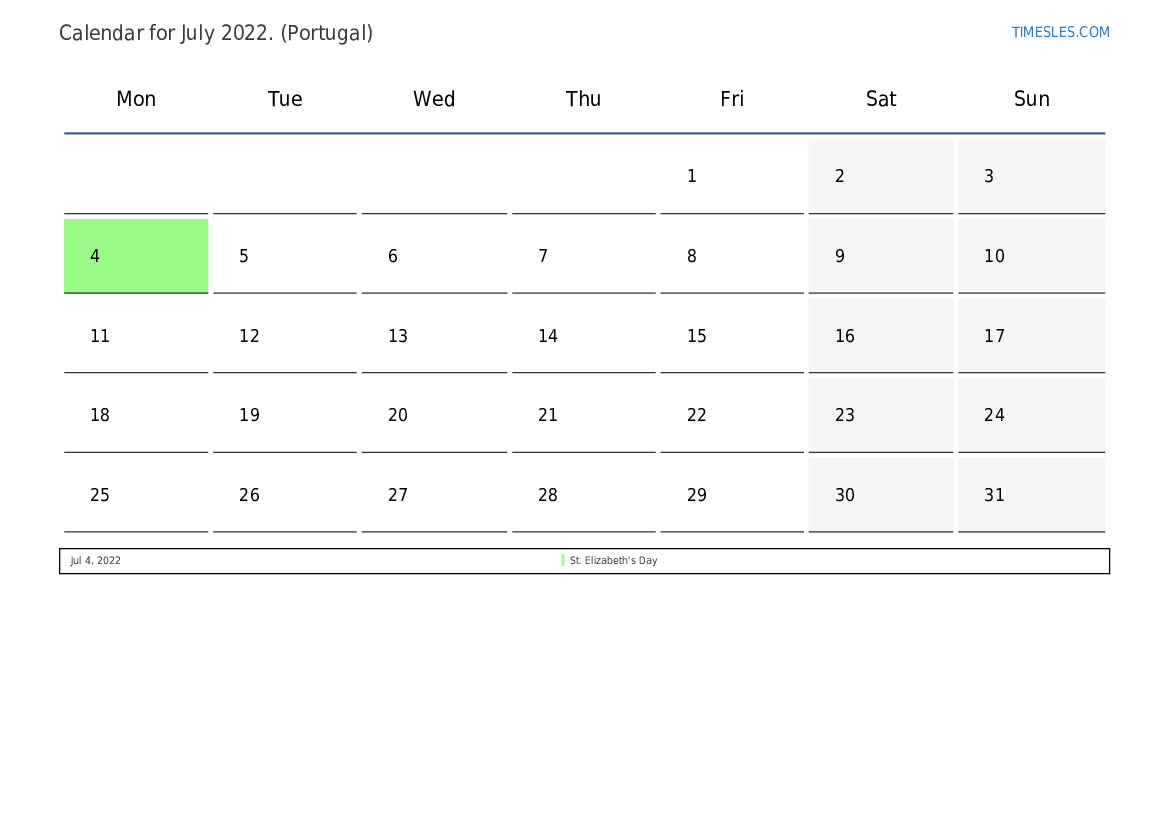The month of July contains 31 days. This is 7 month of 2022. Season of the year: summer. The month of July starts on Friday and ends on Sunday. In the month of July 2022, there are 1 holiday and day off in Portugal.
