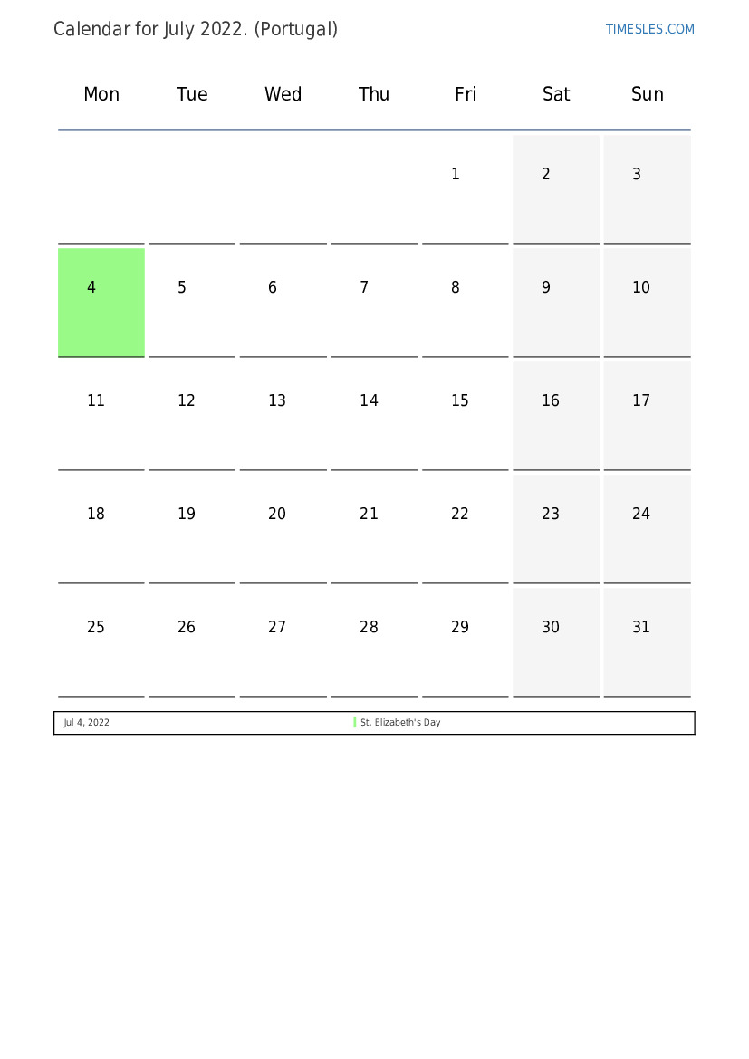 Holidays and Weekends Calendar for July 2022 for Portugal