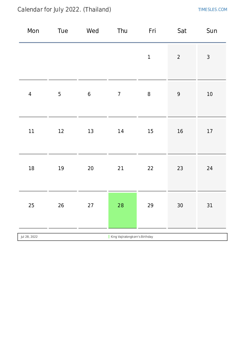 The month of July contains 31 days. This is 7 month of 2022. Season of the year: summer. The month of July starts on Friday and ends on Sunday. In the month of July 2022, there are 1 holiday and day off in Thailand.