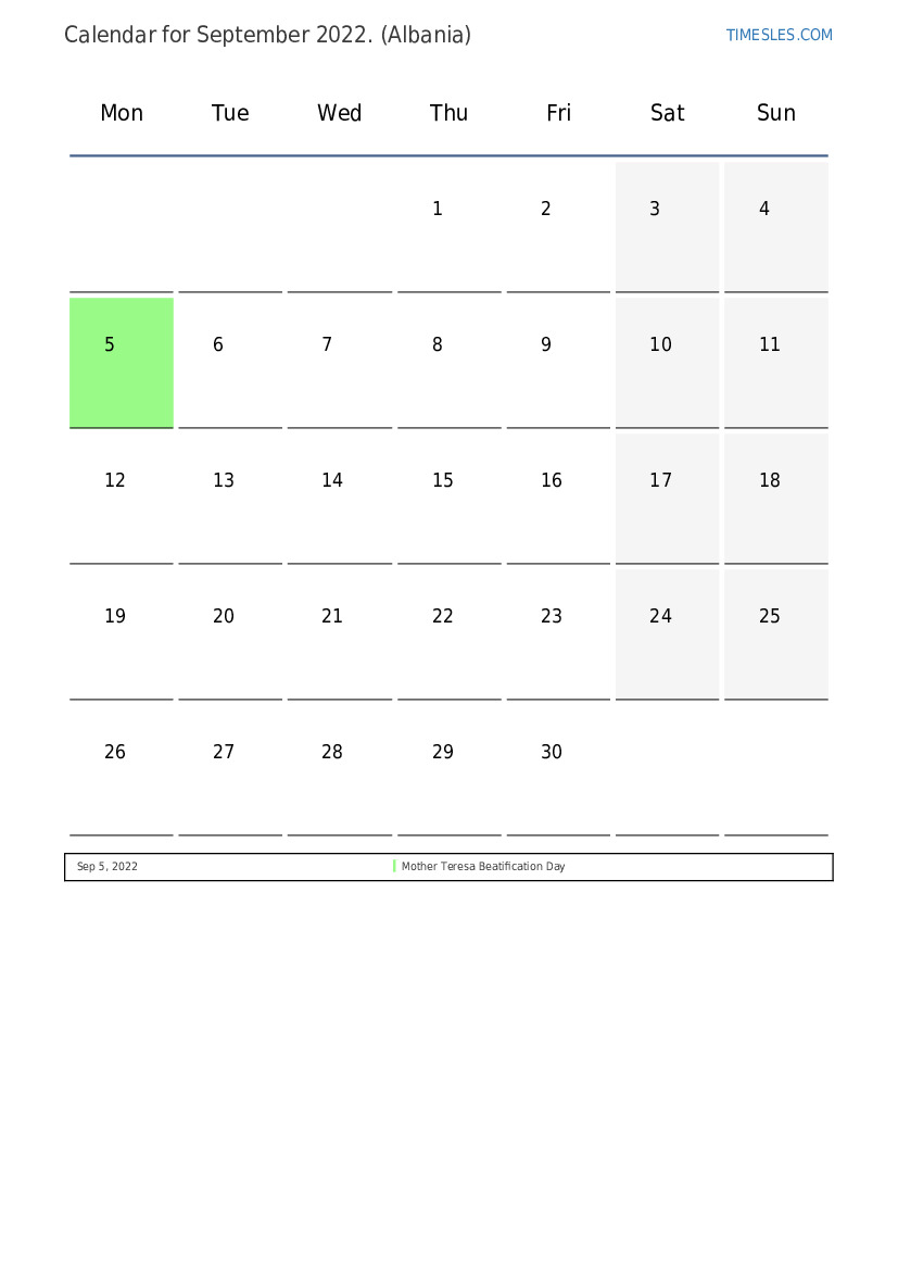 The month of September contains 30 days. This is 9 month of 2022. Season of the year: autumn. The month of September starts on Thursday and ends on Friday. In the month of September 2022, there are 2 holidays and days off in Albania.