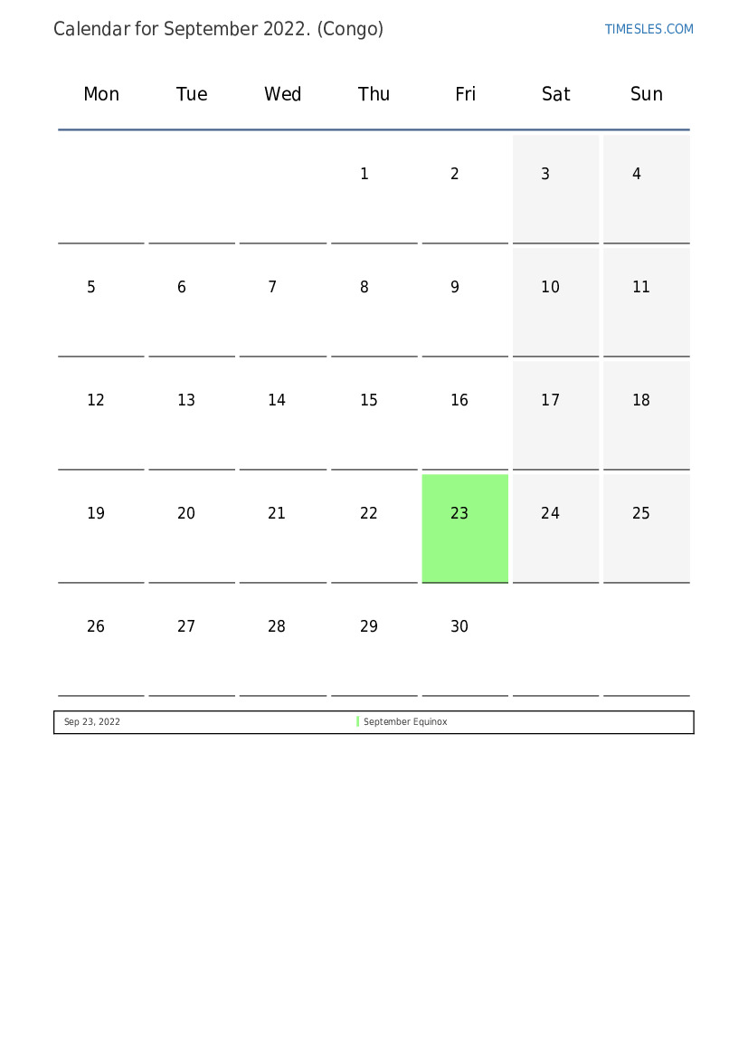 The month of September contains 30 days. This is 9 month of 2022. Season of the year: autumn. The month of September starts on Thursday and ends on Friday. In the month of September 2022, there are 1 holiday and day off in Congo.
