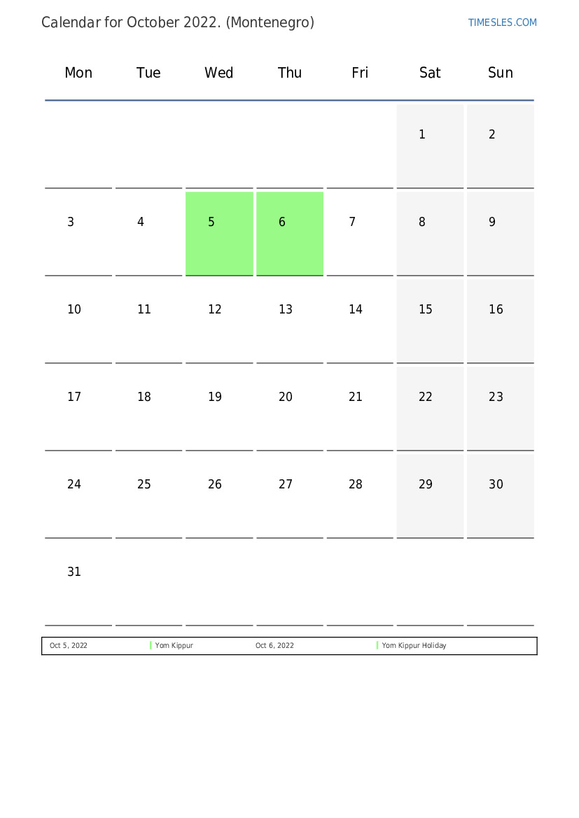 Holidays and Weekends Calendar for October 2022 for Montenegro
