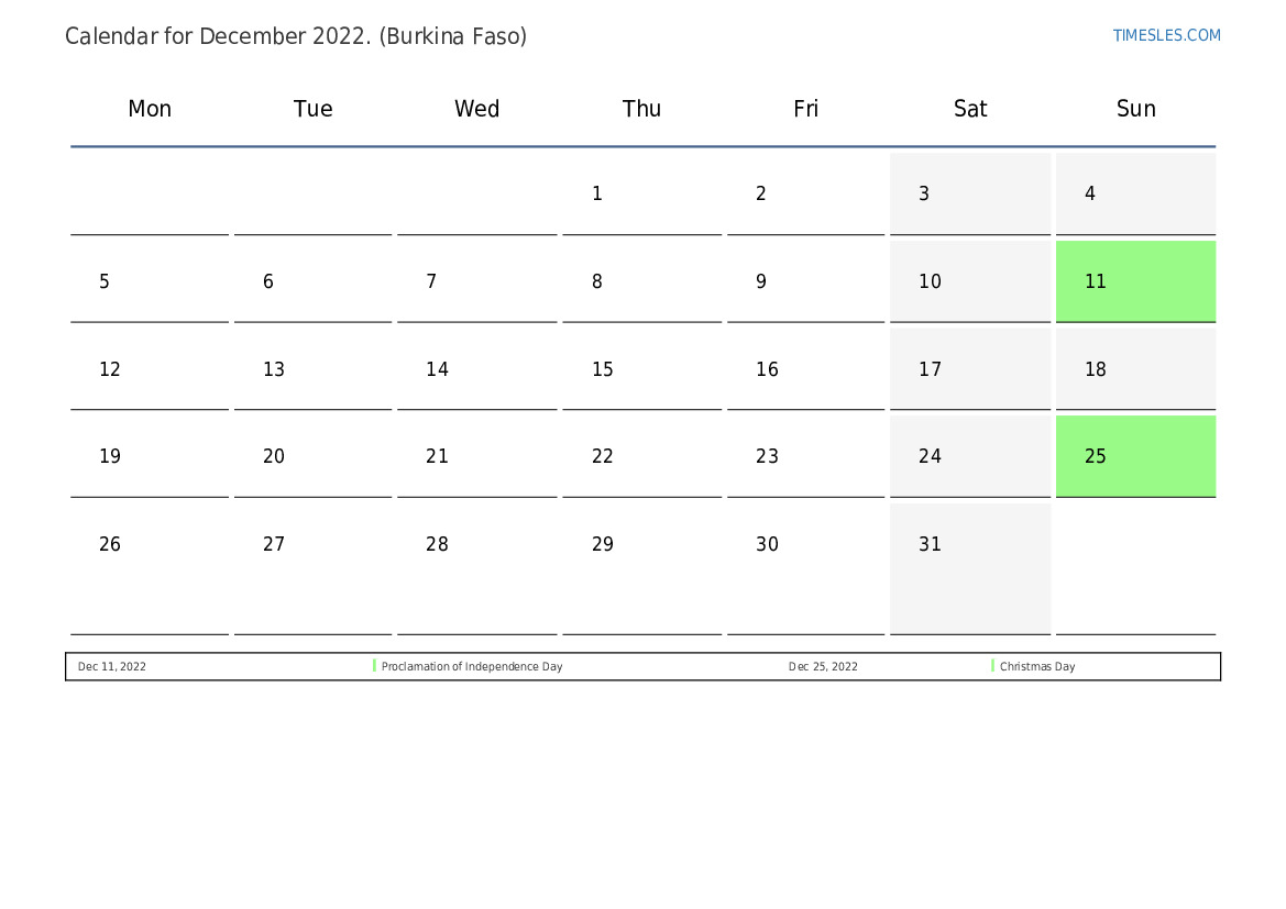 Holidays and Weekends Calendar for December 2022 for Burkina Faso