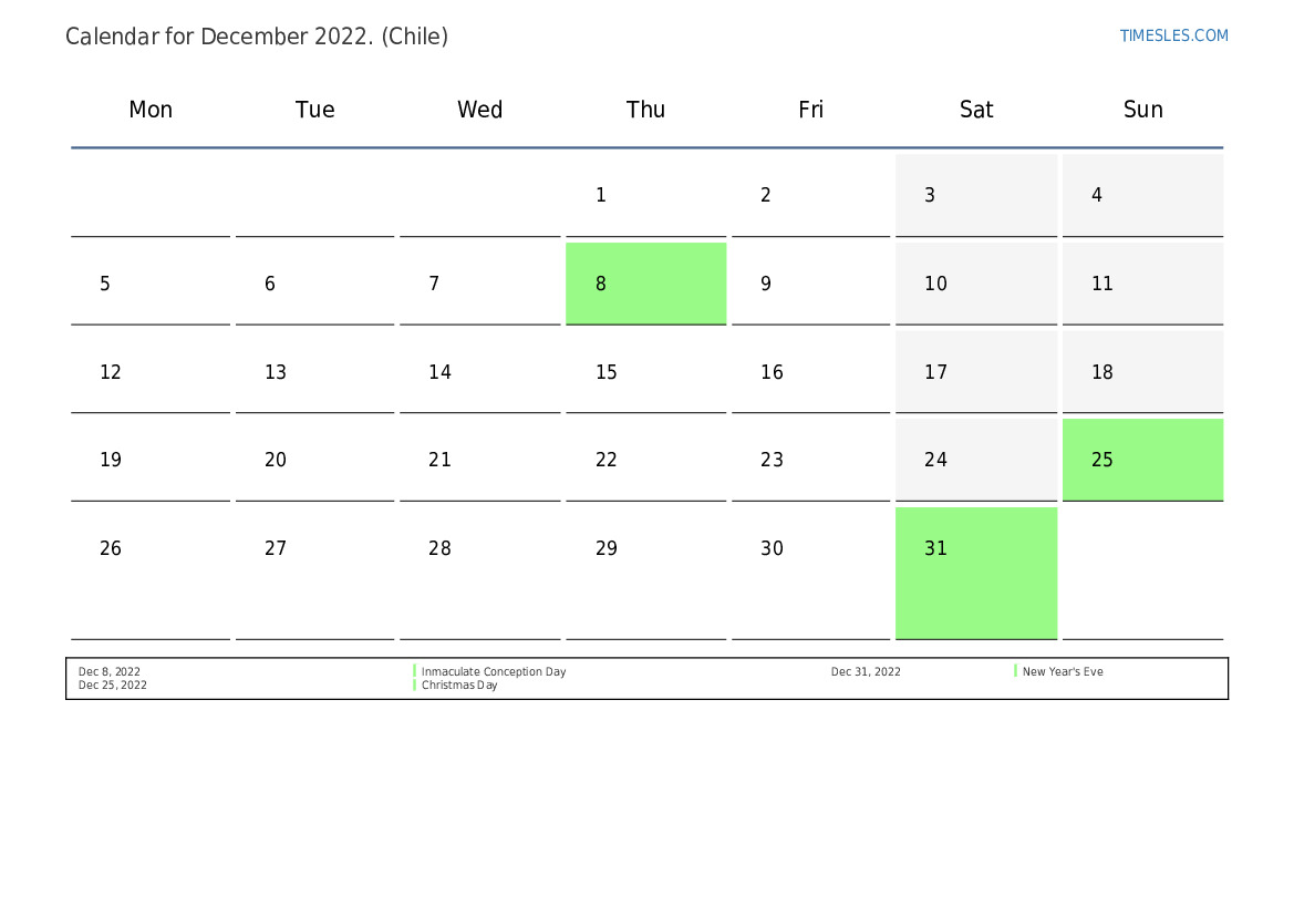 The month of December contains 31 days. This is 12 month of 2022. Season of the year: winter. The month of December starts on Thursday and ends on Saturday. In the month of December 2022, there are 4 holidays and days off in Chile.