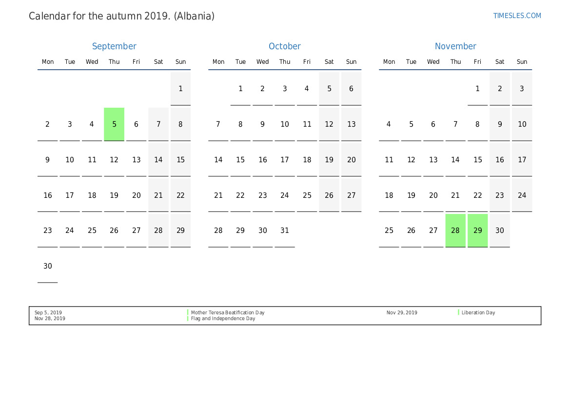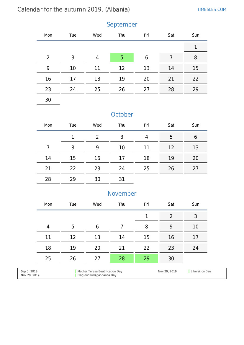 Download and print PDF calendar with holidays and weekends for the autumn of 2019 for Albania