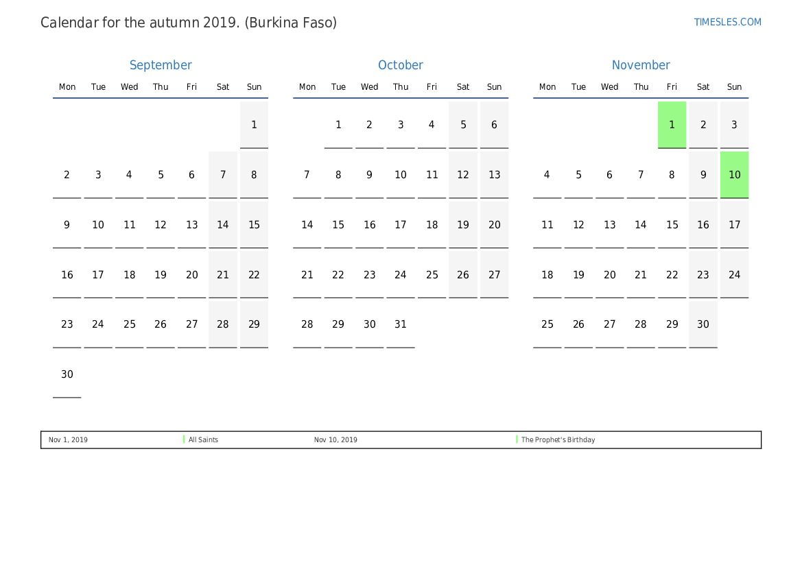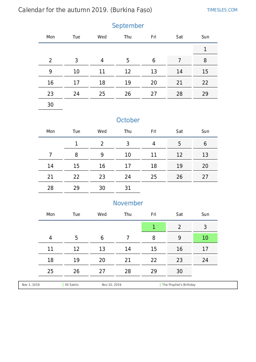 Download and print PDF calendar with holidays and weekends for the autumn of 2019 for Burkina Faso