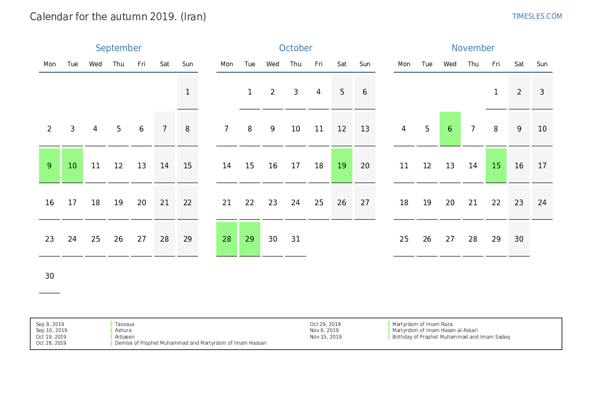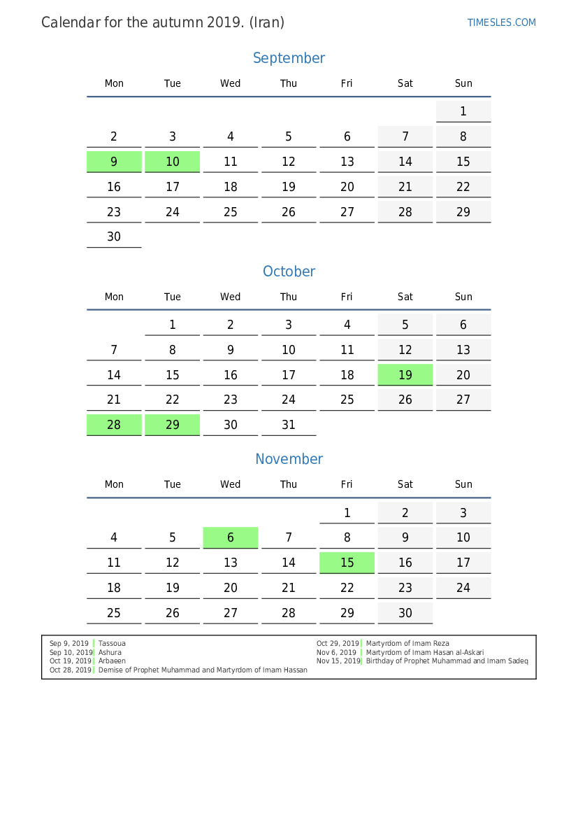 Download and print PDF calendar with holidays and weekends for the autumn of 2019 for Iran