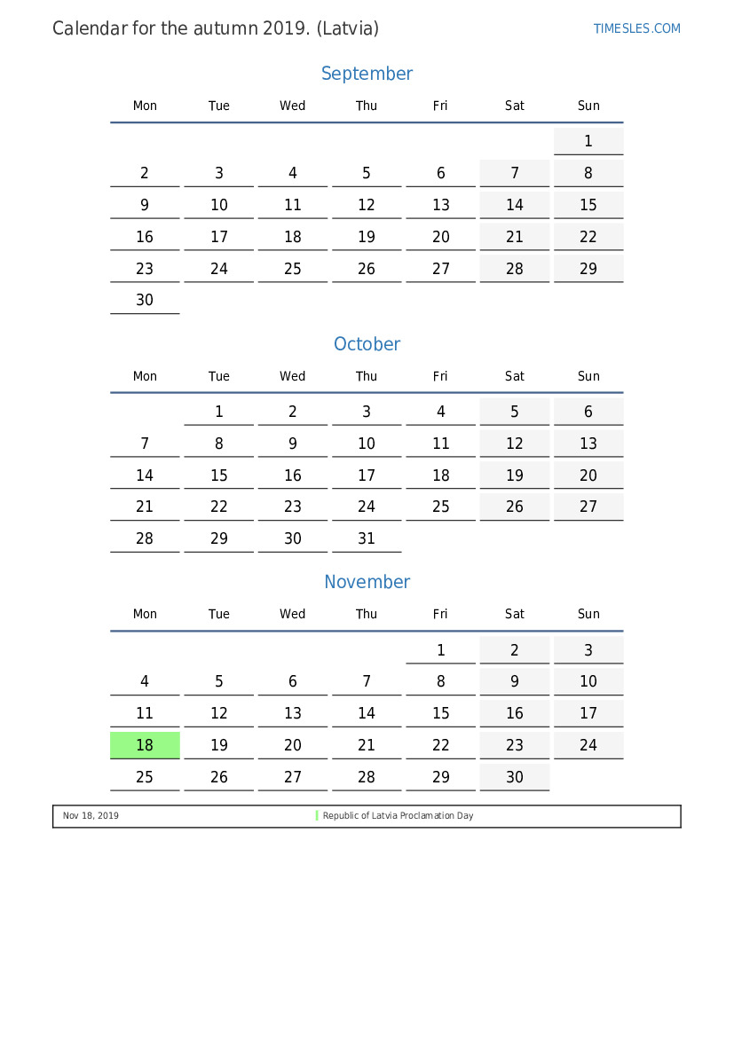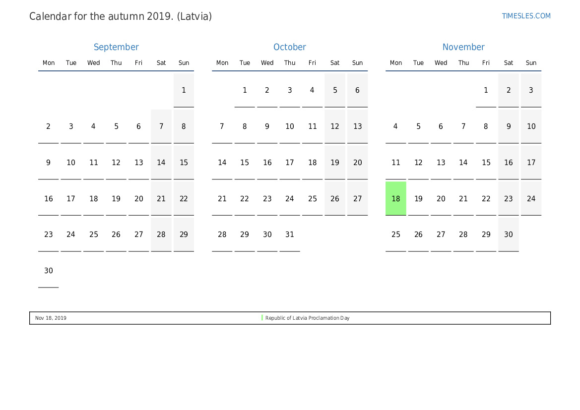In the autumn of 2019, there are 5 holidays and days off in Latvia. Autumn 2019 starts on Sunday and ends on Saturday.