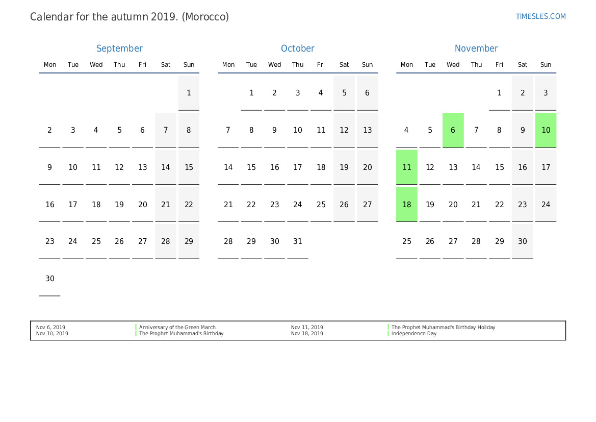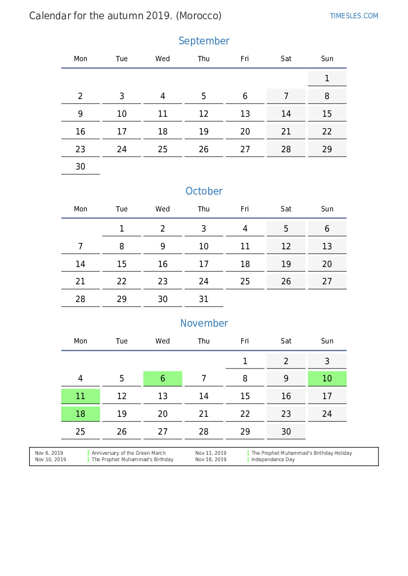Download and print PDF calendar with holidays and weekends for the autumn of 2019 for Morocco