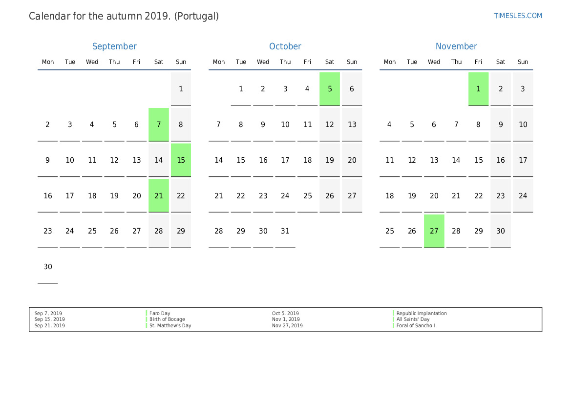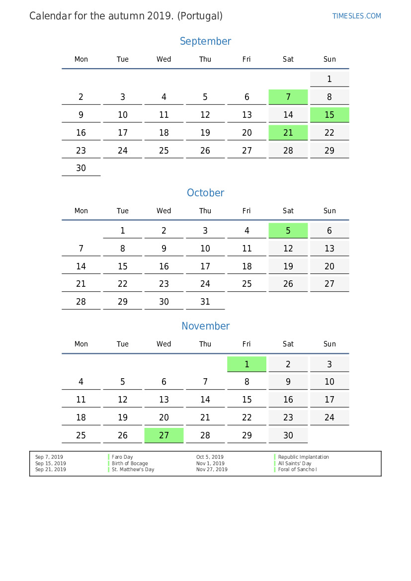 Autumn calendar 2019 for Portugal