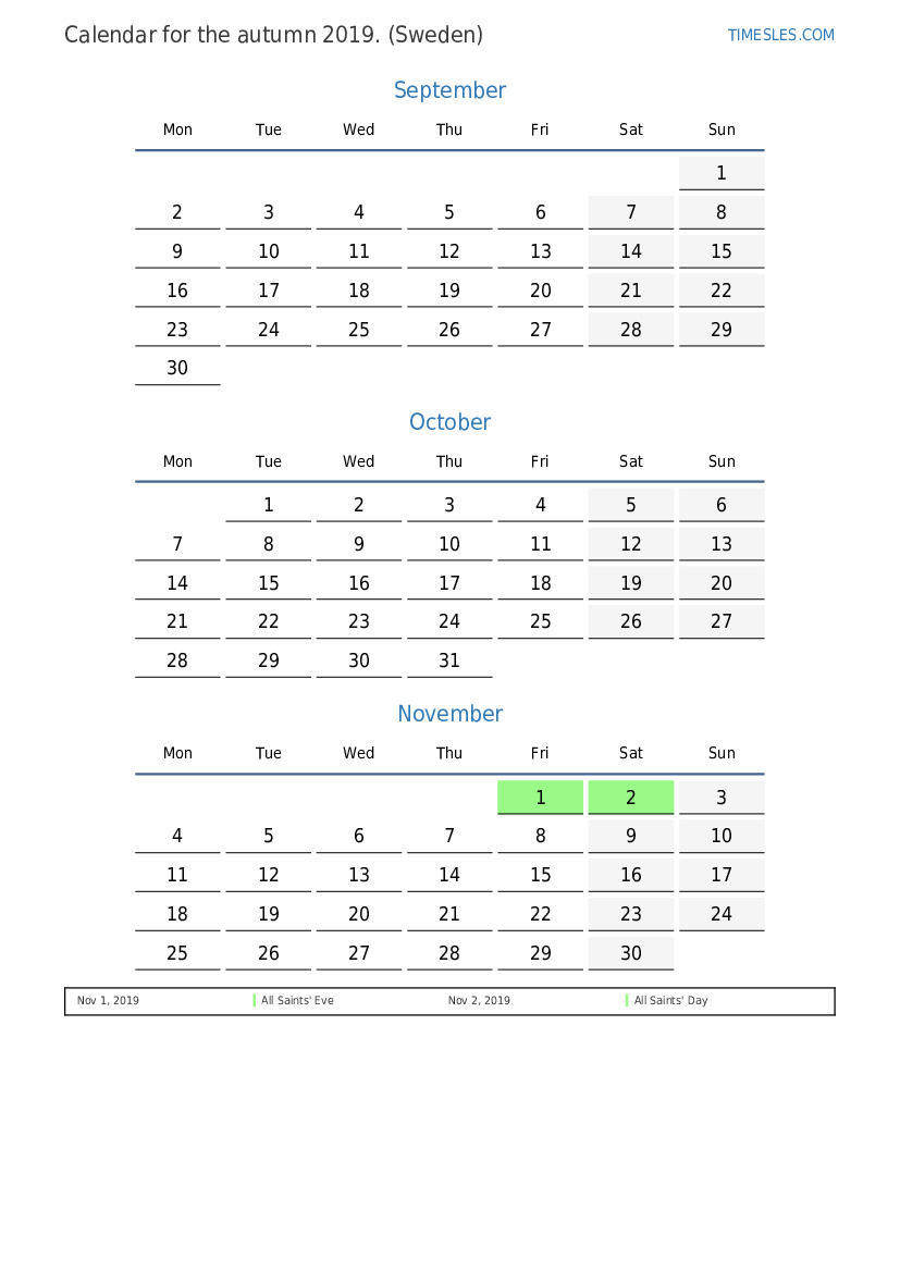 Calendar of holidays and weekends for the autumn of 2019 for Sweden
