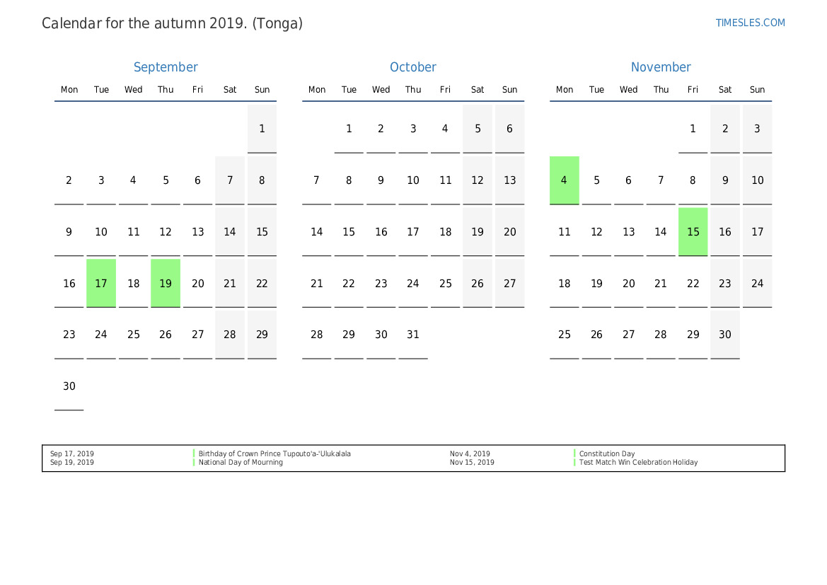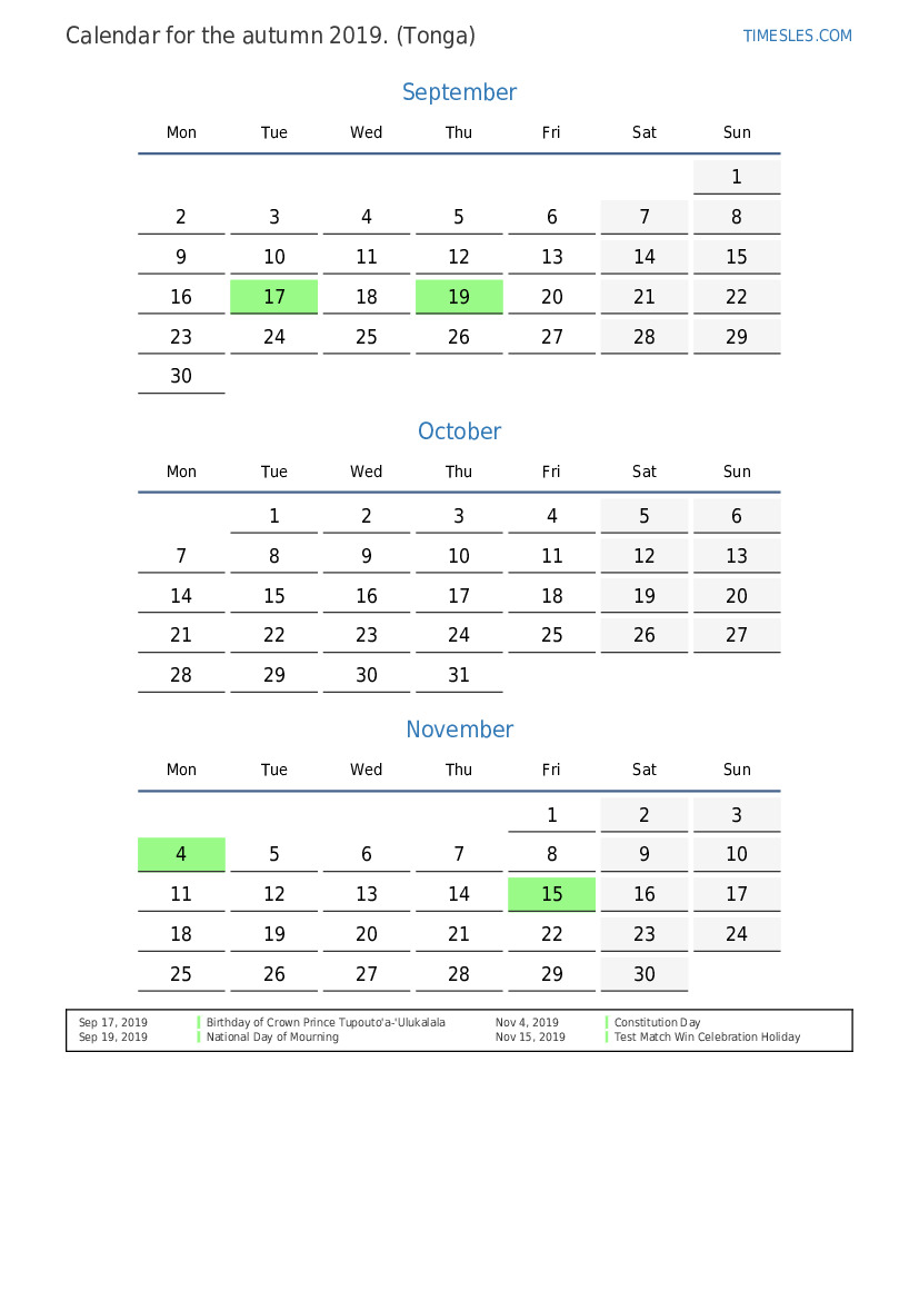 Download and print PDF calendar with holidays and weekends for the autumn of 2019 for Tonga